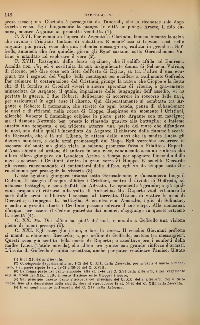 (3) La prima parte (lei canto risponde alle st. 1-44 del C. XVI della Liberata, e poi vagamente alle st. 57-66 del XIX. Tutto il resto (l'azione sotto Gioppe) è nuovo.