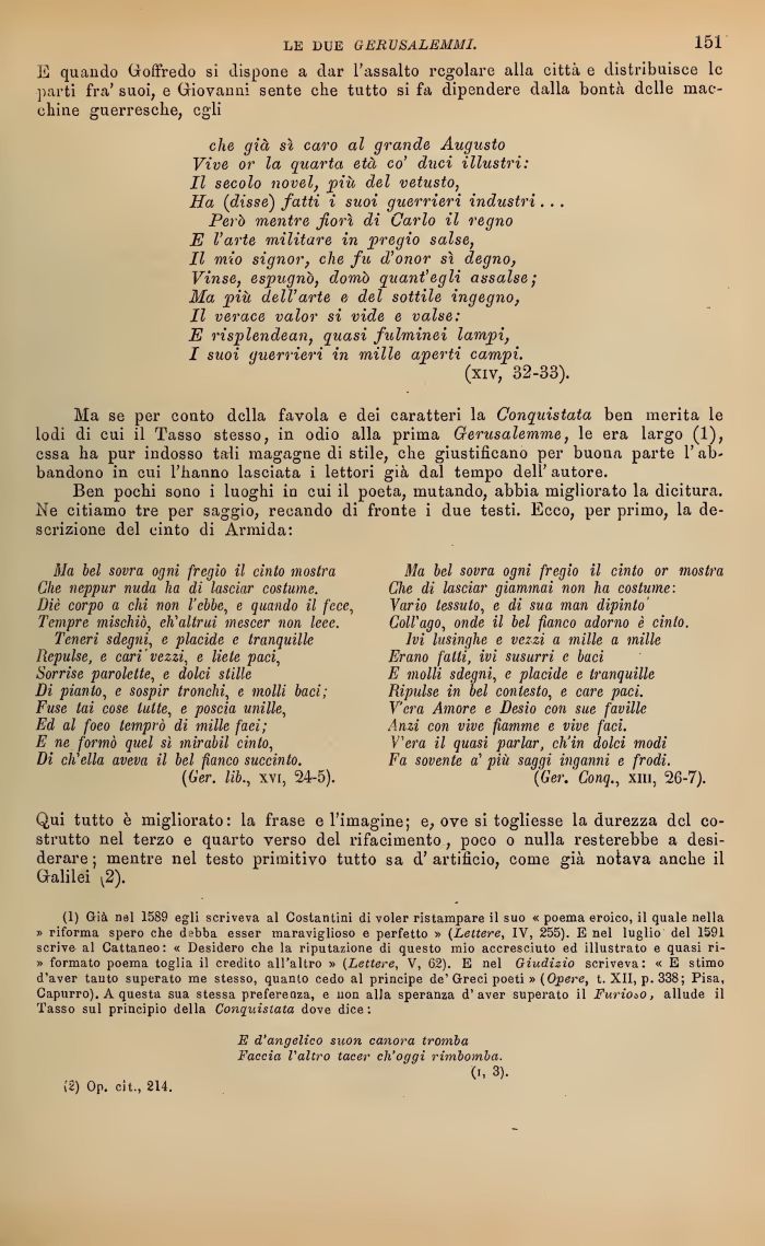 (1) Già nel 15S9 egli scriveva al Costantini di voler ristampare il suo « poema eroico, il quale nella » riforma spero che d^bba esser maravigìioso e perfetto » (Lettere, IV, 235). E nel luglio del 1591 scrive al Cattaneo: « Desidero che la riputazione di questo mio accresciuto ed illustrato e quasi ri» formato poema toglia il credito all'altro » (Lettere, V, 62). E nel Giudizio scriveva: « E stimo d'aver tanto superato me stesso, quanto cedo al principe de' Greci poeti » {Opere, t. XII, p.338; Pisa, Capurro). A questa sua stessa preferenza, e non alla speranza d'aver superato il Furioso, allude il Tasso sul principio della Conquistala dove dice: