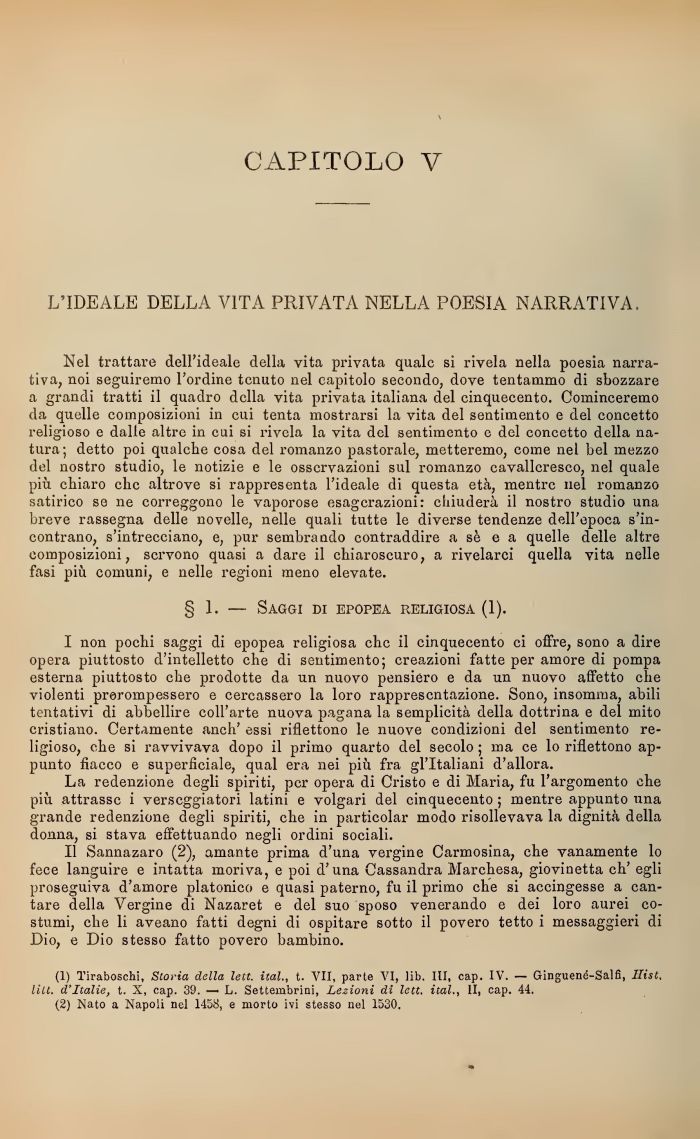 Nel trattare dell'ideale della vita privata quale si rivela nella poesia narrativa, noi seguiremo l'ordine tenuto nel capitolo secondo, dove tentammo di sbozzare a grandi tratti il quadro della vita privata italiana del cinquecento. Cominceremo da quelle composizioni in cui tenta mostrarsi la vita del sentimento e del concetto religioso e dalle altre in cui si rivela la vita del sentimento e del concetto della natura; detto poi qualche cosa del romanzo pastorale, metteremo, come nel bel mezzo del nostro studio, le notizie e le osservazioni sul romanzo cavalleresco, nel quale più chiaro chc altrove si rappresenta l'ideale di questa età, mentre nel romanzo satirico se ne correggono le vaporose esagerazioni: chiuderà il nostro studio una breve rassegna delle novelle, nelle quali tutte le diverse tendenze dell'epoca s'incontrano, s'intrecciano, e, pur sembrando contraddire a sè e a quelle delle altre composizioni, servono quasi a dare il chiaroscuro, a rivelarci quella vita nelle fasi più comuni, e nelle regioni meno elevate.