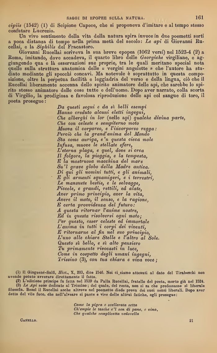 Giovanni Rucellai scriveva la sua breve epopea (1062 vcrs.) nel 1523-4 (2) a Roma, imitando, dove accadeva, 1 quarto libro delle Georg ehe virgiliane, e aggiungendo qua e là osservazioni suo proprie, tra le quali mer'tano special nota quelle sulla struttura anatomica delle u vergi* ' angclette n che l'autore ha studiato mediante gli specchi concavi. Ma notevole è soprattutto in questa composizione, oltre la peipetua facoltà e leggiadria del verso e della lingua, < ò che il Rucella1' li meramente accenna dello spirito animatore delle api, chc sarebbe lo sp* rito stesso animatore delle cose tutte e dell'uomo. Dopo aver narrato, colla scorta di Virgilio, la prodigiosa e favolosa riproduzione delle api col sangue di toro, il poeta prosegue :