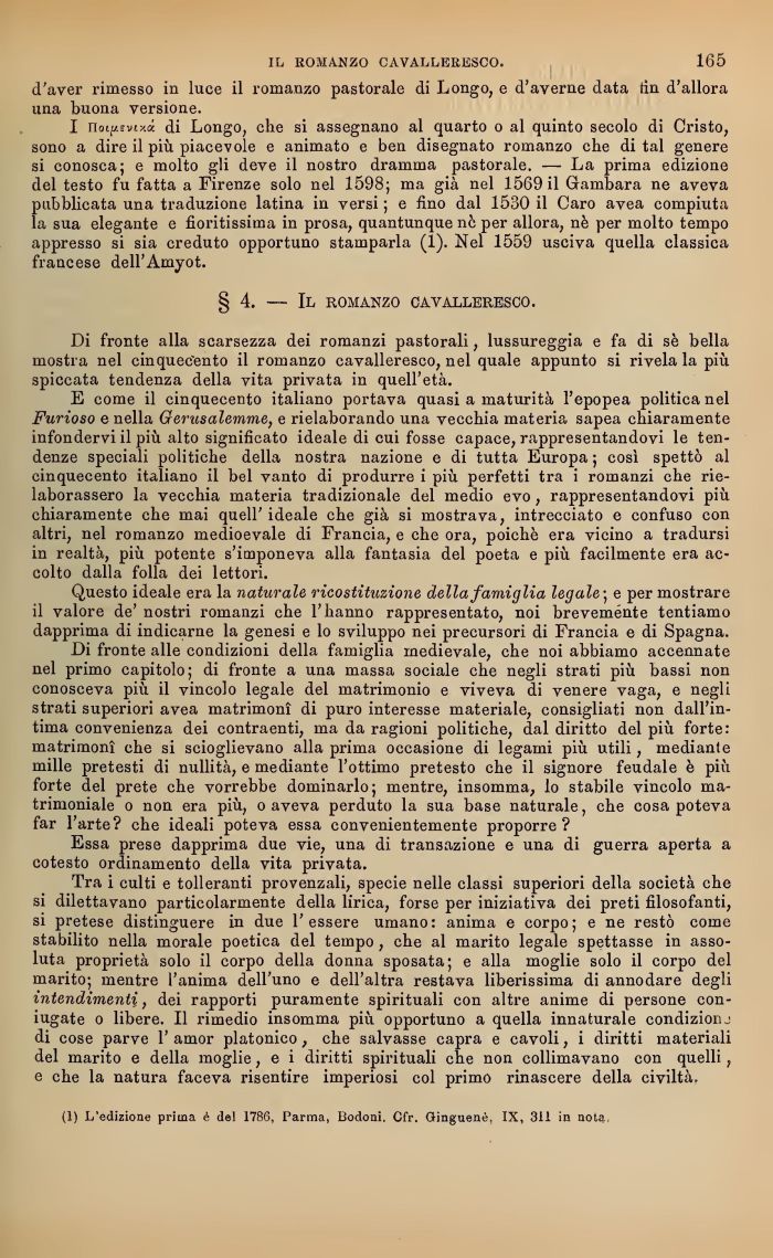 E come d cinquecento taliano portava quasi a matuntà l'epopea polilicancl Furioso e nella Gerusalemme, e riclaborando una vecchia materia sapea chiaramente infondervi il più alto significato ideale di cui fosse capace, rappresentandov le tendenze speciali poh ìohe della nostra naz'one e di tutta Europa; così spettò al cinquecento aliano il bel vanto di produrre i più perfetti tra i rpmane che rielaborassero la vecchia materia tradiz male del medio evo, rappresentandovi più chiaramente chc mai quell'ideale che già si mostrava, intrecciato e confuso con altri, nel romanzo medioevale di Francia, c che ora, poiché era vicino a tradursi m realtà, più potente s'imponeva alla fantasia del poeta e più facilmente era accolto dalla folla dei lettori.