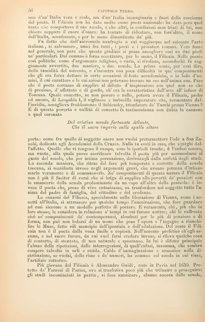 Più giovane del Filicaia è Alessandro Guidi, nato in Pavia nel 1650. Protetto da' Farnesi di Parma, ove si trasferiva poco più che trilustre a proseguirvi gli studi incominciati in patria, si fece ammirare, alunno ancora delle scuole,