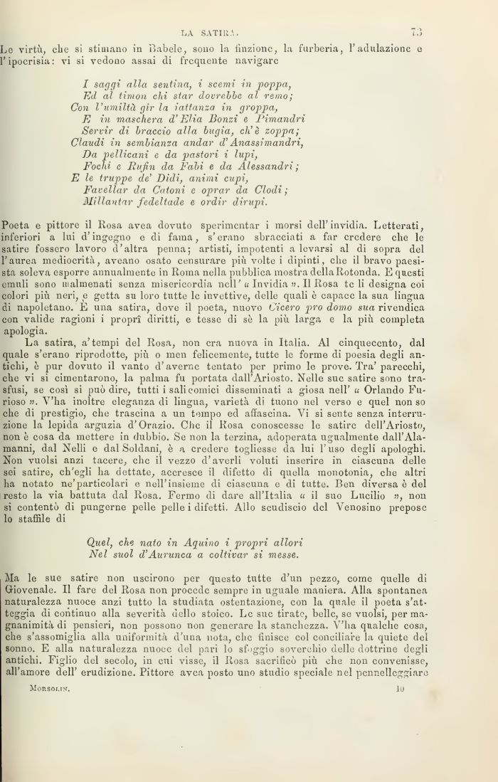 Ma le sue satire non uscirono per questo tutte d'un pezzo, come quelle di Giovenale. Il fare del Rosa non procede sempre in uguale maniera. Alla spontanea naturalezza nuoce anzi tutto la studiata ostentazione, con la quale il poeta s'atteggia di continuo alla severità dello stoico. Le sue tirate, belle, se vuoisi, per magnanimità di pensieri, non possono non generare la stanchezza. V'ha qualche cosa, che s'assomiglia alla uniformità d'una nota, chc finisce col conciliare la quiete del sonno. E alla naturalezza nuoce del pari lo sfoggio soverchio delle dottrine degli antichi. Figlio del secolo, in cui visse, il Rosa sacrificò più che non convenisse, all'amore dell' erudizione. Pittore avea posto uno studio speciale nel pcnnellcggiare