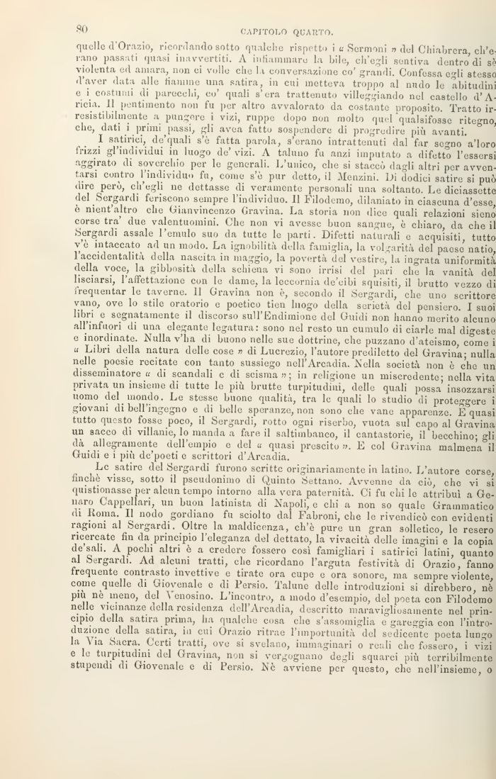 Le satire del Sergardi furono scritte originariamente in latino. L'autore corse, finche visse, sotto il pseudonimo di Quinto Settano. Avvenne da ciò, che vi si quistionasse per alcun tempo intorno alla vera paternità. Ci fu chi le attribuì a Gc-naro Cappellari, un buon latinista di Napoli, e chi a non so quale Grammatico di Roma. Il nodo gordiano fu sciolto dal Fabroni, che le rivendicò con evidenti ragioni al Sergardi. Oltre la maldicenza, ch'è pure un gran solletico, le resero ricercate fin da principio l'eleganza del dettato, la vivacità delle imagini e la copia de'sah. A pochi altri è a credere fossero così famigliari i satirici latini, quanto al Sergardi. Ad alcuni tratti, che ricordano l'arguta festività di Orazio, fanno frequente contrasto invettive e tirate ora cupe e ora sonore, ma sempre violenti, come quelle di Giovenale e di Persio. Talune delle introduzioni si direbbero, nè più nè meno, del Venosino. L'incontro, a modo d'esempio, del poeta con Filodemo nelle vicinanze della residenza dell'Arcadia, descritto maravigliosamente nel principio della satira prima, ha qualche cosa che s'assomiglia e gareggia con l'introduzione della satira, in cui Orazio ritrae l'importunità* del sedicente poeta lungo la Via Sacra. Certi tratti, ove si svelano, immaginari o reali che fossero, i vìzi e le turpitudini del Gravina, non si vergognano degli squarci più terribilmente stupendi di Giovenale e di Persio. Nè avviene per questo, che nell'insieme, o