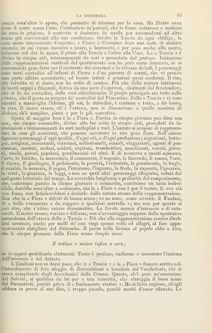 eenzia senz altro lo sposo, elie promette di ritornar per la eena. Lia Pietro avea fatto il eonto senza l'oste. Contrariato da'parenti, che lo fanno catturare e mettere fin anco in prigione, è costretto a desistere da quelle per accomodarsi ad altre nozze più convenienti alla sua condizione. Sciolta la Tancia da ogni obbligo, la cosa muta interamente d'aspetto; e Ceeeo e Ciampino dopo una serie di sinistre vicende, in cui vanno incontro a paure, a bastonate, c per poco anche alla morte, finiscono col dar la mano, il primo alla Tancia e l'altro alla Cosa. La u Taneia » è divisa in einquc atti, inframmezzati da eori c preceduta dal prologo. Imitazione delle rappresentazioni rusticali del quattroeento non ha però certo intreccio, nò si raeeomanda gran fatto per il contrasto dei caratteri e la vivezza dc'sali. 1 personaggi sono tutti contadini all'infuori di Pietro e d'un parente eli costui, chc vi prende una parte affatto secondaria; ed hanno istinti e passioni quasi conformi. 11 riso, che talvolta vi si desta, non ha nulla di comico. Più che dalla natura intrinseca de'motti arguti e frizzanti, deriva da una serie d'equivoci, risultanti dal frantenderc, chc si fa da' contadini, delle voci cittadincsehe. 11 pregio principale sta tutto nella p ttura, ehe il poeta sa porgere de' contadini del Fiorentino. Nella u Tancia » vi sono ritratti a maraviglia l'idioma, gli usi, le abitudini, i costumi c tutta, a dir breve, la vita. Il metro stesso, eli' è l'ottava, non si diseonvienc a quella maniera di dialogo, eli'c semplice, piana e per lo più narrativa.