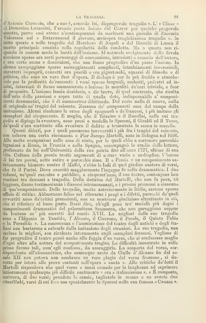 d'Antonio Caraccio, che u non è, secondo lui, dispregevole tragedia ». L' » Ulisse » di Domenico Lazzarini, 1 arcade poeta lodato dal Carrcr per qualche pregevole sonetto, parve così atroce a'eontemporanei da meritarsi una parodia di Zaccaria Valaresso nel « Rutzvansead il giovane, areisopra tragicissima tragedia ». In tutte queste e nelle tragedie del Marchese di Napoli e del Bianchi di Lueca il merito principale consiste nella regolarità della condotta, ita a questa non risponde in nessun modo la bontà dell'insieme. Al naturale svolgimento della favola noceiono spesso ora eerti personaggi di convenzione, introdotti a comodo dell'autore, e ora certe scene e descrizioni, ehe non fanno progredire d'un passo l'azione. In alcune campeggiano spesso seeneggiamenti complicati, intralciamenti inverosimili, caratteri impropri!, concetti ora puerili e ora giganteschi, squarei di filosofia e di politica, chc sono un vero fuor d'opera. Il dialogo è per lo più freddo e stucchevole per la prolissità de'raeconti: i versi spesso languidi, scoloriti, pedestri ed insulsi, intarsiati di forme ammanierate e leziose: la moralità de'cori triviale, e fuor di proposito. L'insieme lascia desiderio, a dir breve, di quel contrasto, ehe risulta dall'urto delle passioni e sopra tutto di quella dote, indispensabile a' eomponi-menti drammatici, che è di ammaestrar dilettando. Del resto nulla di nuovo, nulla di originale ne' tragici del seieento. Nessuno de' componenti esce del campo della imitazione. Alcuni ricalcano le orme degli spagnuoli e de'francesi, i più imitano gli esemplari del cinquecento. E meglio, che il Trissino e il Rueellai, nelle cui tragedie si dipinge la sventura, sono presi a modello lo Speroni, il Giraldi ed il Tasso, da'quali s'era sostituito alla sventura il delitto e tramutata la seena in macello.
