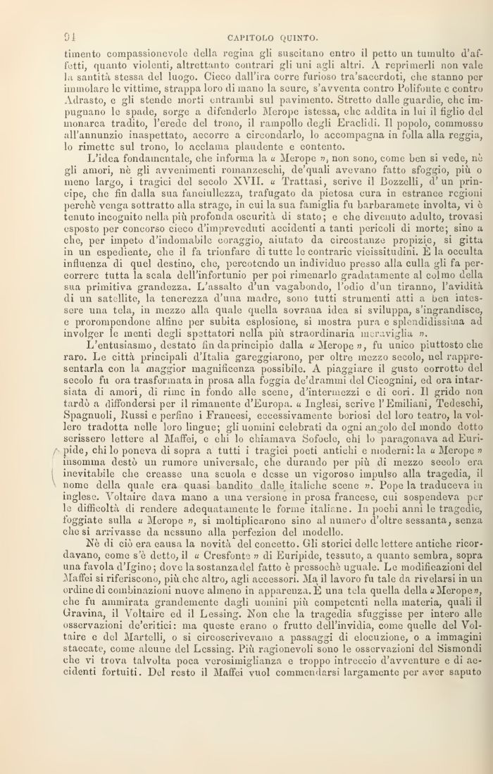 L'entusiasmo, destato fin da principio dalla «Merope», fu unico piuttosto che raro. Le città principali d'Italia gareggiarono, per oltre mezzo secolo, nel rappresentarla con la maggior magnificenza possibile. A piaggiare il gusto corrotto del secolo fu ora trasformata in prosa alla foggia de'drammi del Cicognini, ed ora intarsiata di amori, di rime in fondo alle scene, d'intermezzi e di cori. 11 grido non tardò a diffondersi per il rimanente d'Europa. « Inglesi, scrive l'Emiliani, Tedeschi, Spagnuoli, Russi e perfino i Francesi, eccessivamente boriosi del loro teatro, la vollero tradotta nelle loro lingue; gli uomini celebrati da ogni angolo del mondo dotto scrissero lettere al Maffei, e ehi lo chiamava Sofocle, ehi lo paragonava ad Euri! f- pide, chi lo poneva di sopra a tutti i tragici poeti antichi e moderni: la u Merope » insomma destò un rumore universale, che durando per più di mezzo secolo era inevitabile che creasse una scuola e desse un vigoroso impulso alla tragedia, il nome della quale era quasi bandito dalle italiche scene ». Pope la traduceva in inglese. Voltaire dava mano a una versione in prosa francese, cui sospendeva per le difficoltà di rendere adequatamente le forme italiane. In pochi anni le tragedie, foggiate sulla u Merope », si moltiplicarono sino al numero d'oltre sessanta, senza che si arrivasse da nessuno alla perfezion del modello.