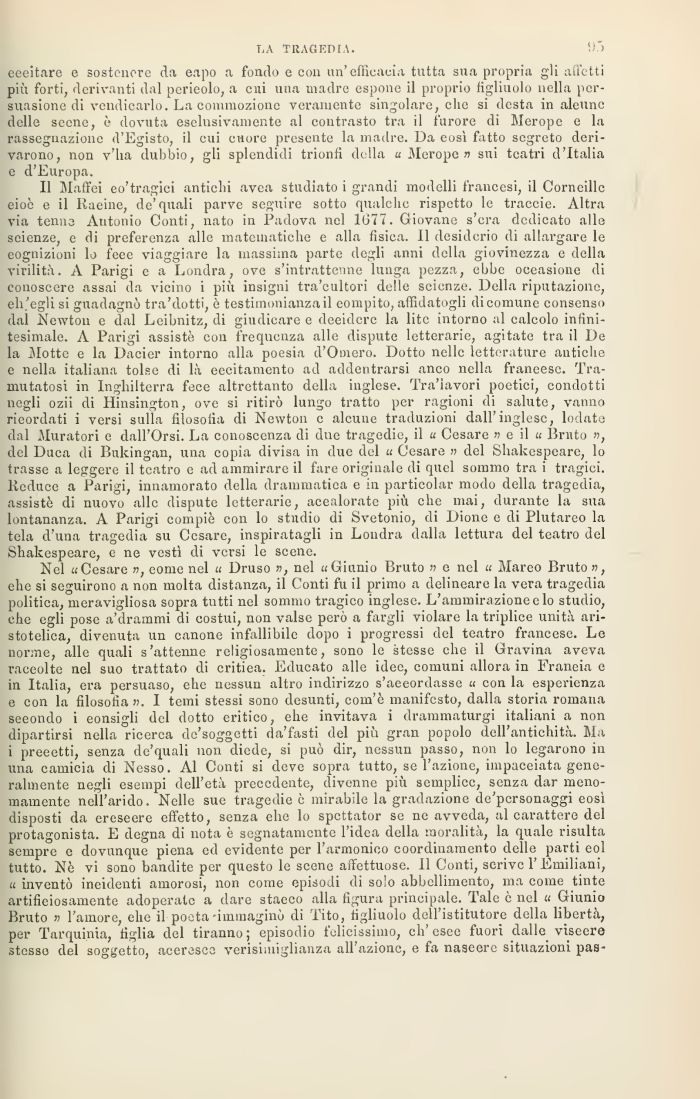 Il Maffei «tragici antichi avea studiato i grandi modelli francesi, il Corneillc eioè e il Raeine, de'quali parve seguire sotto qualche rispetto le traccie. Altra via tenne Antonio Conti, nato in Padova nel 1077. Giovane s'era dedicato alle scienze, e di preferenza alle matematiche e alla fisica. Il desiderio di allargare le cognizioni lo feee viaggiare la massima parte degli anni della giovinezza e della Ivi ili il tà. A Parigi e a Londra, ove s'intrattenne lunga pezza, ebbe occasione di conoscere assai da vicino i più insigni tra'cultori delle scienze. Della riputazione, eh'egli si guadagnò tra'dotti, è testimonianza il eonipito, affidatogli di comune consenso dal Newton e dal Leibnitz, di giudicare e deeidcrc la lite intorno al calcolo infinitesimale. A Parigi assistè con frequenza alle dispute letterarie, agitate tra il De la Motte e la Dacier intorno alla poesia d'Omero. Dotto nelle letterature antiche e nella italiana tolse di là eccitamento ad addentrarsi anco nella franeese. Tramutatosi in Inghilterra fece altrettanto della inglese. Tra'iavori poetici, condotti negli ozii di Hinsington, ove si ritirò lungo tratto per ragioni di salute, vanno ricordati i versi sulla filosofia di Newton e alcune traduzioni dall'inglese, lodate dal Muratori e dall'Orsi. La conoscenza di due tragedie, il « Cesare » e il « Bruto », del Duca di Bukingan, una copia divisa in due del « Cesare » del Shakespeare, lo trasse a leggere il teatro e ad ammirare il fare originale di quel sommo tra i tragici. Reduce a Parigi, innamorato della drammatica e in particolar modo della tragedia, assistè di nuovo alle dispute letterarie, accalorate più che mai, durante la sua lontananza. A Parigi compiè con lo studio di Svetonio, di Dione e di Plutareo la tela d'una tragedia su Cesare, inspiratagli in Londra dalla lettura del teatro del Shakespeare, e ne vestì di versi le scene.