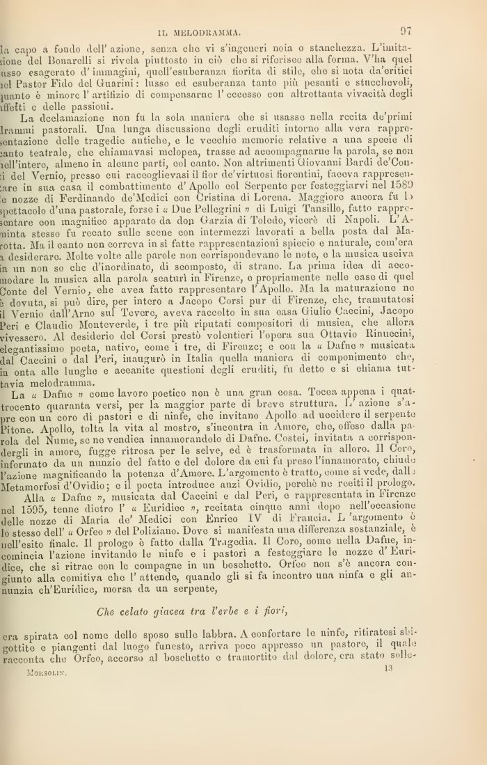 La declamazione non fu la sola maniera elie si usasse nella recita de'primi Inalimi pastorali. Una lunga discussione degli eruditi intorno alla vera rappresentazione delle tragedie antiche, e le vecchie memorie relative a una specie di lauto teatrale, che ehiamavasi mclopea, trasse ad accompagnarne la parola, se non lelfiltero, almeno in alcune parti, eoi canto. Non altrimenti Giovanni Bardi de'Coii-i del Vernio, presso cui raceoglievasi il fior de'virtuosi fiorentini, faceva rappresen-;ire in sua casa il combattimento d' Apollo eoi Serpente per festeggiarvi nel 1589 e nozze di Ferdinando de'Mcdici eon Cristina di Lorena. Maggiore ancora fu b spettacolo d'una pastorale, forse i u Due Pellegrini » di Luigi Tansillo, fatto rapprr-5(f,{tre eon magnifico apparato da don Garzia di Toledo, viceré di Napoli. L'A-minta stesso fu recato sulle scene eon intermezzi lavorati a bella posta dal Malo t fi. Ma il canto non correva in si fatte rappresentazioni spiccio e naturale, com'era % desiderare. Multe volte alle parole non corrispondevano le note, e la musica usciva \ un non so chc d'inordinato, di scomposto, di strano. La prima idea di aeco-uodare la musica alla parola scaturì in Firenze, e propriamente nelle case di quel Òonte del Vernio, elie avea fatto rappresentare l'Apollo. Ma la maturazione ne è dovuta, si può dire, per intero a Jacopo Corsi pur di Firenze, chc, tramutatosi il Vernio dall'Arno sul Tevere, aveva raccolto in sua casa Giulio Caecini, Jacopo Peri e Claudio Monteverde, i tre più riputati compositori di musiea, che allora vivessero. Al desiderio del Corsi prestò volentieri l'opera sua Ottavio llinuecini, elegantissimo poeta, nativo, come i tre, di Firenze; e eou la u Dafne » musicata dal' Caceini e dal Peri, inaugurò in Italia quella maniera di componimento che, in onta alle lunghe e accanite questioni degli eruditi, fu detto e si chiama tuttavia melodramma.