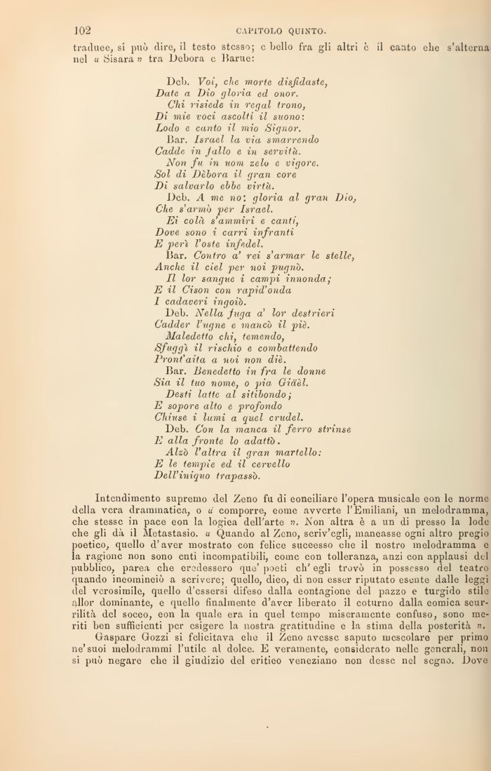 Intendimento supremo del Zeno fu di eoneiliare l'opera musicale eon le norme della vera drammatica, o u comporre, eome avverte l'Emiliani, un melodramma, che stesse in pace eon la logiea dell'arte ». Non altra è a un di presso la lode che gli dà il Metastasio. u Quando al Zeno, scriv'cgli, maneasse ogni altro pregio poetico, quello d'aver mostrato con felice suceesso che il nostro melodramma e la ragione non sono enti incompatibili, come con tolleranza, anzi eon applausi del pubblico, parea che erodessero quo' poeti eh' egli trovò in possesso del teatro quando ineomineiò a scrivere; quello, dieo, di non esser riputato esente dalle leggi del verosimile, quello d'essersi difeso dalla eontagione del pazzo e turgido stile allor dominante, e quello finalmente d'aver liberato il coturno dalla eomica scurrilità del soceo, eon la quale era in quel tempo miseramente confuso, sono meriti ben sufficienti per esigere la nostra gratitudine e la stima della posterità ».
