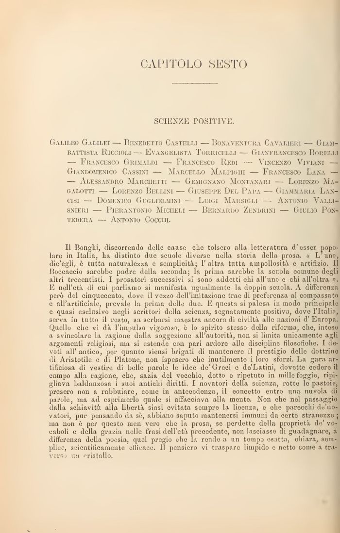 Il Bonghi, discorrendo delle cause che tolsero alla letteratura d'esser pupo-lare in Italia, ha distinto due scuole diverse nella storia della prosa, u L'uno, die'egli, è tutta naturalezza e semplicità; 1' altra tutta ampollosità e artifizio. Il Boccaccio sarebbe padre della seconda; la prima sarebbe la scuola comune degl' altri trecentisti. I prosatori successivi si sono addetti ehi all'uno e chi all'altra ;>. E nell'età di cui parliamo si manifesta ugualmente la doppia scuola. A differenza però del cinquecento, dove il vezzo dell'imitazione trae di preferenza al compassato e all'artificiale, prevale la prima delle due. E questa si palesa in modo principale e quasi eselusivo negli scrittori della scienza, segnatamente positiva, dove l'Italia, serva in tutto il resto, sa serbarsi maestra ancora di civiltà alle nazioni d'Europa. Quello che vi dà l'impulso vigoroso, è lo spirito stesso della riforma, che, inteso a svincolare la ragione dalla soggezione all'autorità, non si limita unicamente agli argomenti religiosi, ma si estende con pari ardore alle discipline teosofiche. I devoti all' antico, per quanto siensi brigati di mantenere il prestigio delle dottrine di Aristotile e di Platone, non ispescro che inutilmente i loro sforz'. La gara artificiosa di vestire di belle parole le idee de' Greci e de'Latini, dovette cedere il campo alla ragione, che, sazia del vecchio, detto e ripetuto in mille foggio, ripigliava baldanzosa i suoi antichi diritti. I novatori della scienza, rotte le pastoie, presero non a rabbuiare, come in antecedenza, il concetto entro una nuvola eli parole, ma ad esprimerlo quale si affacciava alla mente. Non che nel passaggio dalla schiavitù alla libertà siasi evitata sempre la licenza, e che parecchi de novatori, pur pensando da se, abbiano saputo mantenersi immuni da certe stranezze ; ma non è per questo men vero che la prosa, se perdette della proprietà de' vocaboli e della grazia nelle frasi dell'età precedente, non lasciasse di guadagnare, a differenza della poesia, quel pregio che la rende a un tempo esatta, chiara, semplice, scientificamente efficace. Il pensiero vi traspare limpido e netto come a traverso un ^ristailo.