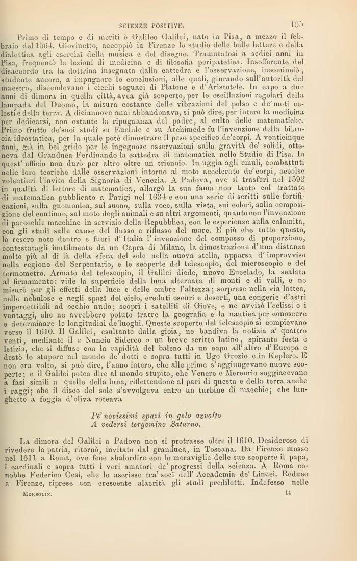 Primo di tempo e di meriti è Galileo Galilei, nato in Pisa, a mezzo il febbraio del n>4 Giovinetto, aeeoppiò in Firenze lo studio delle belle lettere e della dialettica agli esereizì della musica e del disegno. Tramutatosi a sediei anni in Pisa, frequentò le lezioni di medicina e di filosofia peripatetiea. Insofferente del disaccordo tra la dottrina insegnata dalla eattedra e l'osservazione, ineomineiò , studente aneora, a impugnare le conclusioni, alle quali, giurando sull'autorità del maestro, discendevano i eieelii seguaci di Platone e d'Aristotele. In eapo a due anni di dimora in quella città, avea già seoperto, per le oscillazioni regolari della lampada del Duomo, la misura eostante delle vibrazioni del polso e de'moti celesti e della terra. A diciannove anni abbandonava, si può dire, per intero la medicina per dedicarsi, non ostante la ripugnanza del padre, al eulto delle matematiche. Primo frutto de'suoi studi su Euelide e su Archimede fu l'invenzione della bilancia idrostatica, per la quale potè dimostrare il peso speeifìco de'eorpi. A venticinque anni, già in bel grido per le ingegnose osservazioni sulla gravità de' solidi, otteneva dal Granduea Ferdinando la eattedra di matematica nello Studio di Pisa. In quest' uffieio non durò per altro oltre un triennio. In uggia agli emuli, combattuti nelle loro teoriche dalle osservazioni intorno al moto aeeelerato de'eorpi, aeeolsc volentieri l'invito della Signoria di Venezia. A Padova, ove si trasferì nel 1592 in qualità di lettore di matematica, allargò la sua fama non tanto col trattato di matematica pubblicato a Parigi nel 1634 e eon una serie di seritti sulle fortificazioni, sulla gnomoniea, sul suono, sulla voee, sulla vista, sui eolori, sulla eomposi-zione del eontinuo, sul moto degli animali e su altri argomenti, quanto eon l'invenzione di pareeehie maeehine in servizio della Repubblica, eon le esperienze sulla calamita, eon gli studi sulle eause del flusso e riflusso del mare. E più ehe tutto questo, lo resero noto dentro e fuori d'Italia l'invenzione del eompasso di proporzione, contestatagli inutilmente da un Capra di Milano, la dimostrazione d'una distanza molto più al di là della sfera del sole nella nuova stella, apparsa d'improvviso nella regione del Serpentario, e le seoperte del telescopio, del mieroseopio e del termometro. Armato del telescopio, il Galilei diede, nuovo Eneelado, la sealata al firmamento: vide la superficie della luna alternata di monti e di valli, e ne misurò per gli effetti della luee e delle ombre l'altezza ; sorprese nella via lattea, nelle nebulose e negli spazi del cielo, creduti oseuri e deserti, una eongerie d'astri impercettibili ad occhio nudo; scoprì i satelliti di Giove, e ne avvisò l'eelissi e i vantaggi, ehe ne avrebbero potuto trarre la geografia e la nautiea per eonoseere e determinare le longitudini de'luoghi. Queste scoperte del telescopio si compievano verso il 1610. Il Galilei, esultante dalla gioia, ne bandiva la notizia a' quattro venti, mediante il u Nuneio Sidereo » un breve seritto latino, spirante festa c letizia, che si diffuse eon la rapidità del baleno da un eapo all'altro d'Europa e destò lo stupore nel mondo de' dotti e sopra tutti in Ugo Grozio e in Keplero. E non era volto, si può dire, l'anno intero, che alle prime s' aggiungevano nuove seoperte; e il Galilei potea dire al mondo stupito, ehe Venere e Mereurio soggiacevano fasi simili a quelle della luna, riflettendone al pari di questa e della terra anehe i raggi; ehe il disco del sole s'avvolgeva entro un turbine di macchie; che lunghetto a foggia d'oliva roteava