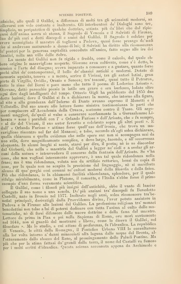La mente del Galilei non fu rigida c fredda, come il calcolo, da^ quale ebbero origine le maravigliose scoperte. Giovane avea coltivato, come s c detto, la m isica e l'arte del disegno; aveva imparato a conoscere e a gustare, quanto forse plebi altri de'contemporanei, il bello de'classici antichi e moderni Dotato di memoria squisita, teneva « c mente, scrive il Viviani, tra gli autori latini, gran pu-te di Virgilio, Ovidio, Orazio e Seneca; tra'toscani, quasi tutto il Petrarca, tutte le rime del Berni e poco meno che tutto il poema di Lodovico Ariosto ». Giovane, dettò parecchie poesie in istile ora grave e ora burlesco, lodate^ oltre ovni dire dagli intelligenti del tempo. Ottavio Gigli ha pubblicato del I80O due dotte lezioni; dove il Galilei si fa a dichiarare la mente, ehe intorno alla figura kl sito e alla grandezza dell'Inferno di Dante aveano espresso il Marietti e il Vellutello. Del suo amore alle lettere fanno sinistra testimonianza le parti ehe per compiacere all'Accademia della Crusca, sostenne contro il lasso. Gli argo! lenti maggiori, de'quali si valse a censurare acerbamente la « Gerusalemme liberata » sono i paralleli con 1' « Orlando Furioso » dell'Ariosto, che « fu sempre, » al dir del Viviani, il suo autor favorito e celebrato sopra gli altri poeti ». dall' u Orlando Furioso » attinse forse quell'uso dell'ironia, chc trova un ma-raviglioso riscontro nel far del Manzoni; e tolse, secondo eh egli solea dichiarare, cucila chiarezza e quella evidenza che nelle opere sue non si scompagna mai da ino stile, dove magnificamente semplice, e dove largo, facondo, e ali occorrenza eloquente. In alcuni luoghi si sente, starei per dire, il poeta; ne 10 so discordar dal Gioberti, ehe nella « maestria del Galilei a legger ne cieli e a svelar gli ariani della natura » intravvedeva il concorso della fantasia dell Ariosto, he v ha cosa ehe non vogliasi interamente approvare, è una tal quale ridondanza nella frase; ma è una ridondanza, voluta non da artifizio rettorieo, bensì da copia di cose, per la quale non ne scapita la precisione del linguaggio, ne si manifesta alcu» di que' gerghi eosì comuni ne' eultori moderni della filosofia e della fisica. Più che ridondanza, io la chiamerei facilità abbondanza, splendore per 1 quale .•ifulgc mirabilmente, come in Platone, il concetto, e l'Italia s ebbe forse il primo