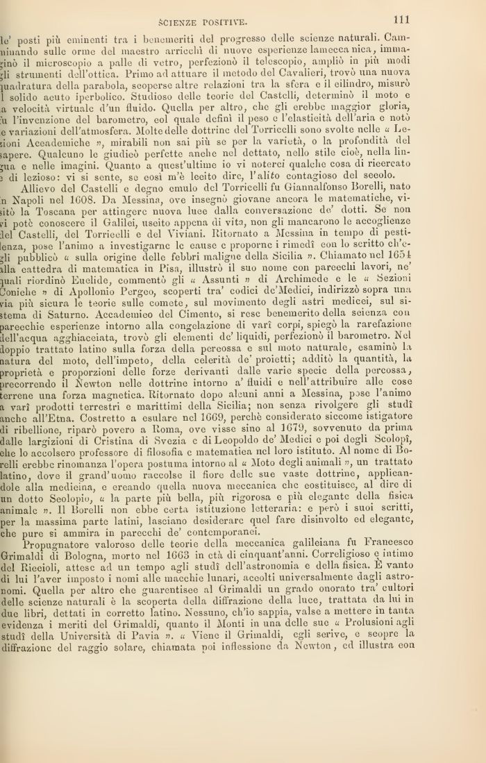 Allievo del Castelli e degno emulo del Torricelli fu Giannalfonso Borelli, nato n Pigoli nel 1G08. Da Messina, ove insegnò giovane ancora le matematiche, visitò la Toscana per attingere nuova luee dalla conversazione de' dotti. Se non ri potè conoscere il Galilei, useito appena di vita, non gli mancarono le accoglienze ilei Castelli, del Torricelli e del Viviani. Ritornato a Messina in tempo ài pesti-euza pose l'animo a investigarne le eause e proporne i rimedi eon lo scritto ch'egli pubblicò u sulla origine delle febbri maligne della Sicilia ». Chiamato nel 1654 illa Cattedra di matematica in Pisa, illustrò il suo nome con parecchi lavori, ne' piali riordinò Euelide, commentò gli u Assunti » di Archimede e le « Sezioni Ooniehe » di Apollonio Pergeo, scoperti tra' codici dc'Medici, indirizzò sopra una pia più sicura le teorie sulle comete, sul movimento degli astri medicei, sul sistema di Saturno. Accademieo del Cimento, si rese benemerito della seienza con pareechie esperienze intorno alla congelazione di vari corpi, spiegò la rarefazione dell'acqua agghiaceiata, trovò gli elementi de' liquidi, perfezionò il barometro. Nel doppio trattato latino sulla forza della pereossa e sul moto naturale, esaminò la nt'tlra del moto, dell'impeto, della celerità de'proietti; additò la quantità, la proprietà e proporzioni delle forze derivanti dalle varie specie della percossa, precorrendo il Newton nelle dottrine intorno a' fluidi e nell'attribuire alle cose terrene una forza magnetica. Ritornato dopo alcuni anni a Messina, pose l'animo a vari prodotti terrestri e marittimi della Sicilia; non senza rivolgere gli studi anche all'Etna. Costretto a esulare nel 1669, perchè considerato siccome istigatore di ribellione, riparò povero a Roma, ove visse sino al 1679, sovvenuto da, prima dalle largizioni di Cristina di Svezia e di Leopoldo de' Medici e poi degli Scolopì, elio lo accolsero professore di filosofia e matematica nel loro istituto. Al nome di Borelli erebbc rinomanza l'opera postuma intorno al u Moto degli animali », un trattato latino, dove il grand'uomo raccolse il fiore delle sue vaste dottrine, applicandole alla medieina, e ereando quella nuova meccanica chc costituisce, al dire di un dotto Seolopio, « la parte più bella, più rigorosa e più elegante della fisica animale ». Il Borelli non ebbe certa istituzione letteraria: e però i suoi scritti, per la massima parte latini, lasciano desiderare quel fare disinvolto ed elegante, che pure si ammira in parecchi de' contemporanei.