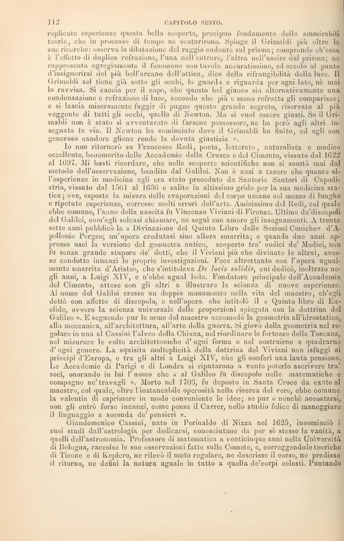 Io non ritornerò su Fi'anceseo llcdi, poeta, letterato , naturalista e meJiel eccellente, benemerito delle Accademie della Crusca e del Cimento, vissuto dal 1022 al 1G97. Mi basti ricordare, che nelle scoperte scientifiche non si scostò mai dal metodo dell'osservazione, bandito dal Galilei. Non è anzi a tacere che quanto all'esperienze in medicina egli era stato preceduto da Santorio Santori di Capod'-stria, vissuto dal 15G1 al 1630 e salito in altissimo grido per la sua medicina statica; ove, esposta la misura delle evaporazioni del corpo umano eoi mezzo di lunghe e ripetute esperienze, corresse molti errori dell'arte. Amicissimo del [tedi, col quale ebbe comune, l'anno della nascita fu Vincenzo Viviani di Firenze. Ultimo de'discepoli del Galilei, com'egli solcasi chiamare, ne segui con amore gli insegnamenti. A trenta sette anni pubblicò la u Divinazione del Quinto Libro delle Sezioni Coniche» d'Apollonio Pergeo; un'opera credutasi sino alloi'a smarrita; e quando due anni appresso useì la versione del geometra antico, scoperto tra' eodici de' Medici, non fu senza grande stupore de' dotti, che il Viviani più che divinato le altrui, avesse condotto innanzi le proprie investigazioni. Fece altrettanto eon l'opera ugualmente smarrita d'Aristeo, che s'intitolava De locis solidis, cui dedicò, inoltrato negli anni, a Luigi XIV, e n'ebbe ugual lode. Fondatore principale dell'Accademia del Cimento, attese eon gli altri a illustrare la scienza di nuove esperienze. Al nome del Galilei eresse un doppio monumento nella vita del maestro, ch'egli dettò eon affetto di discepolo, e nell'opera che intitolò il u Quinto libro di Euclide, ovvero la scienza universale delle proporzioni spiegata eon la dottrina del Galileo ». E seguendo pur le orme del maestro accomodò la geometria all'idrostatica, alla meccanica, all'architettura, all'arte della guerra. Si giovò della geometria nel regolare in una al Cassini l'alveo della Chiana, nel riordinare le fortezze della Toscana, nel misurare le volte architettoniche d' ogni forma e nel eostruirne e quadi'aime d'ogni genere. La squisita molteplicità della dotti'ina del Viviani non isfuggì ai principi d'Europa, e tra gli altri a Luigi XIV, che gli conferì una lauta pensione. Le Accademie di Parigi e di Londra si riputarono a vanto poterlo asci''vere tra soci, onorando in lui 1' uomo che u al Galileo fu discepolo nelle matematiche e compagno ne'travagli ». Morto nel 1703, fu deposto in Santa Croce da ca tto al maestro, col quale, oltre l'instancabile operosità nella rieei'ea del vei'o, ebbe comune la valentia di esprimere in modo conveniente le idee; se pur u nonché accostarsi, non gli entrò forse innanzi, come pensa il Carrer, nello studio felice di maneggiare