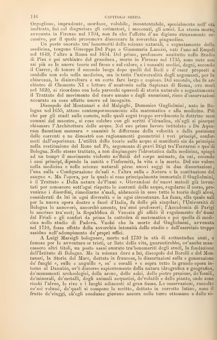 A Luigi Marsigli bolognese, morto nel 1730 in età di scttantadue anni, e famoso per le avventure or tristi, or liete della vita, guarentirebbe, ov'anehe mancassero altri titoli, un posto assai onorato tra'benemeriti degli studi, la fondazione dell'Istituto di Bologna. Ma la scienza deve a lui, discepolo del Borelli e del Montanari, la Storia del Mare, dettata in francese, le dissertazioni sulla u generazione de' funghi », sulle « anguille », su' u coralli » c sopra tutto la grande opera intorno al Danubio, ov'è discorso sapientemente della natura idrografica e geografica, de'monumcnti archeologici, delle arene, delle selci, delle pietre preziose, de'fossi' de'minerali, de'metalli, degli animali acquatici, de'volatili e delle piante, onde sono ricchi l'alveo, le rive e i luoghi adiacenti al gran fiume. Le osservazioni, raccolte ne'sei volumi, de'quali si compone lo scritto, dettato in corretto latino, sono il frutto de'viaggi, ch'egli condusse giovane ancora nelle terre ottomane e delle vi-