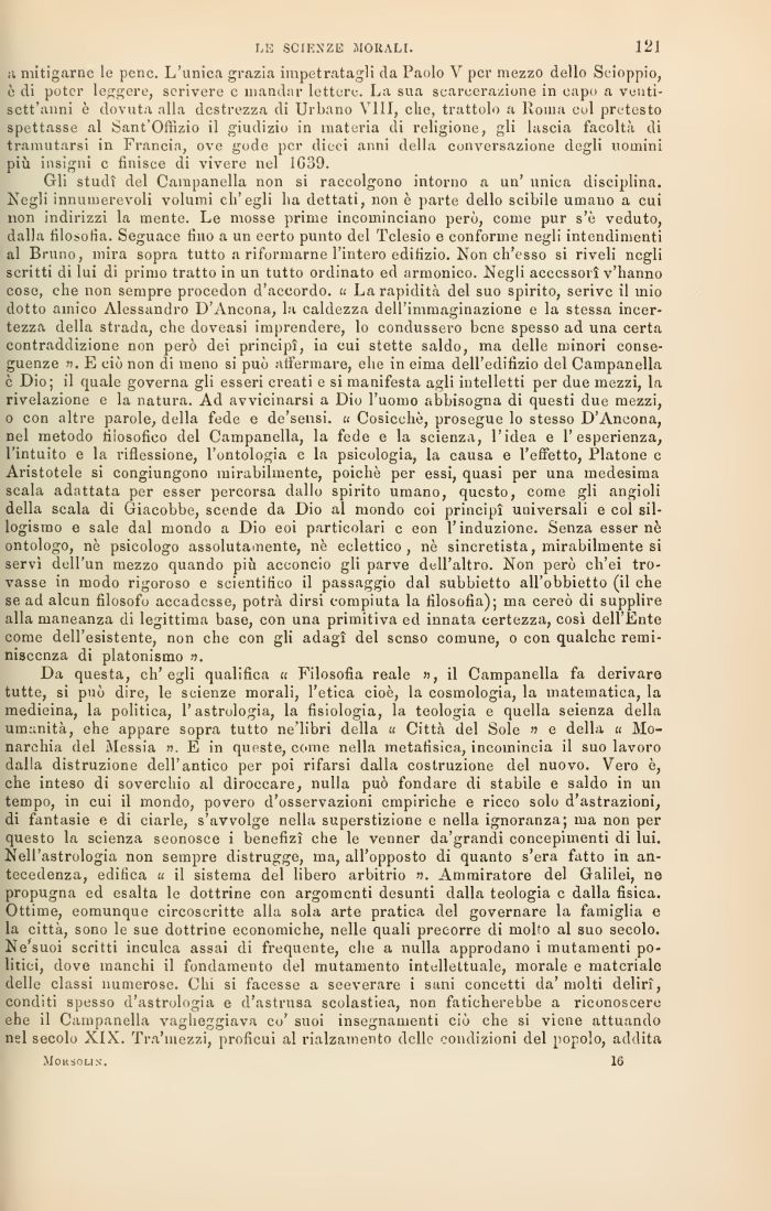 Da questa, ch'egli qualifica « Filosofia reale », il Campanella fa derivare tutte, si può dire, le scienze morali, l'etica cioè, la cosmologia, la matematica, la medicina, la politica, l'astrologia, la fisiologia, la teologia e quella seienza della umanità, ehe appare sopra tutto ne'libri della u Città del Sole » e della u Monarchia del Messia ». E in queste, come nella metafisica, incomincia il suo lavoro dalla distruzione dell'antico per poi rifarsi dalla costruzione del nuovo. Vero è, che inteso di soverchio al diroccare, nulla può fondare di stabile e saldo in un tempo, in cui il mondo, povero d'osservazioni empiriche e ricco solo d'astrazioni, di fantasie e di ciarle, s'avvolge nella superstizione e nella ignoranza; ma non per questo la scienza seonosce i benefizi che le venner da'grandi concepimenti di lui. Nell'astrologia non sempre distrugge, ma, all'opposto di quanto s'era fatto in antecedenza, edifica u il sistema del libero arbitrio ». Ammiratore del Galilei, ne propugna ed esalta le dottrine con argomenti desunti dalla teologia e dalla fisica. Ottime, eomunque circoscritte alla sola arte pratica del governare la famiglia e la città, sono le sue dottrine economiche, nelle quali precorre di molto al suo secolo. Ne suoi scritti inculca assai di frequente, che a nulla approdano i mutamenti politici, dove manchi il fondamento del mutamento intellettuale, morale e materiale delle classi numerose. Chi si facesse a sceverare i sani concetti da' molti deliri, conditi spesso d'astrologia e d'astrusa scolastica, non faticherebbe a riconoscere ehe il Campanella vagheggiava co' suoi insegnamenti ciò che si viene attuando nel secolo XIX. Tra'niezzi, proficui al rialzamento delle condizioni del popolo, addita