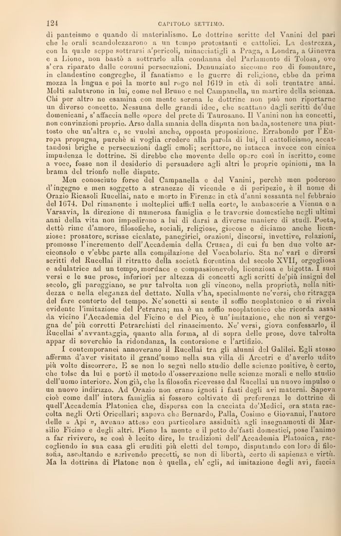 Men conosciuto forse del Campanella e del Vanini, perchè men poderoso d'ingegno e men soggetto a stranezze di vicende e di peripezie, è il nome di Orazio Ricasoli Rucellai, nato e morto in Firenze in età d'anni sessanta nel febbraio del 1674. Del rimanente i molteplici uffici nella corte, le ambascerie a Vienna e a Varsavia, la direzione di numerosa famiglia e le traversie domestiche negli ultimi anni della vita non impedirono a lui di darsi a diverse maniere di studi. Poeta, dettò rime d'amore, filosofiche, sociali, religiose, giocose e diciamo anche licenziose: prosatore, scrisse cicalate, panegirici, orazioni, discorsi, invettive, relazioni, promosse l'incremento dell'Accademia della Crusca, di cui fu ben due volte ar-eiconsolo e v'ebbe parte alla compilazione del Vocabolario. Sta ne' vari e diversi scritti del Rucellai il ritratto della società fiorentina del secolo XVII, orgogliosa e adulatrice ad un tempo, mordace e compassionevole, licenziosa e bigotta. I suoi versi e le sue prose, inferiori per altezza di concetti agli scritti de'più insigni del secolo, gli pareggiano, se pur talvolta non gli vincono, nella proprietà, nella nitidezza e nella eleganza del dettato. Nulla v'ha, specialmente ne'versi, che ritragga del fare contorto del tempo. Ne'sonetti si sente il soffio neoplatonico e si rivela evidente l'imitazione del Petrarca; ma è un soffio neoplatonico che ricorda assai da vicino l'Accademia del Ficino e del Pico, è un'imitazione, clic non si vergogna de'più corretti Petrarchisti del rinascimento. Ne'versi, giova confessarlo, il Rucellai s'avvantaggia, quanto alla forma, al di sopra delle prose, dove talvolta appar di soverchio la ridondanza, la contorsione e l'artifizio.