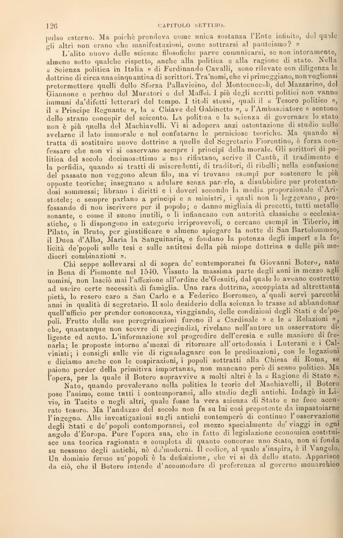 Chi seppe sollevarsi al di sopra de' eontemporanei fu Giovanni Botero, nat in Bena di Piemonte nel 1540. Vissuto la massima parte degli anni in mezzo agli uomini, non lasciò mai l'affezione all'ordine de'Gesuiti, dal quale lo aveano costretto ad uscire certe necessità di famiglia. Una rara dottrina, accoppiata ad altrettanta pietà, lo resero caro a San Carlo e a Federico Borromeo, a'quaL servì parecelii anni in qualità di segretario. Il solo desiderio della seienza lo trasse ad abbandonar quell'ufficio per prender conoscenza, viaggiando, delle condizioni degli Stati e de'popoli. Frutto delle sue peregrinazioni furono il u Cardinale » e le u Relazioni » J e he, quantnnque non scevre di pregiudizi, rivelano nell'autore un osservatore diligente ed acuto. L'informazione sul progredire dell'eresia e sulle maniere di frenarla; le proposte intorno a'mezzi di ritornare all'ortodossia i Luterani e i ( al-vinisti; i eonsigli sulle vie di riguadagnare con le predieazioni, cor. \e legazioni e diciamo anche con le cospirazioni, i popoli sottratti alla Chiesa di Roma, se paiono perder della primitiva importanza, non mancano però di senno politico. Ma l'opera, per la quale il Botero sopravvive a molti altri è la u Ragione di Stato ».