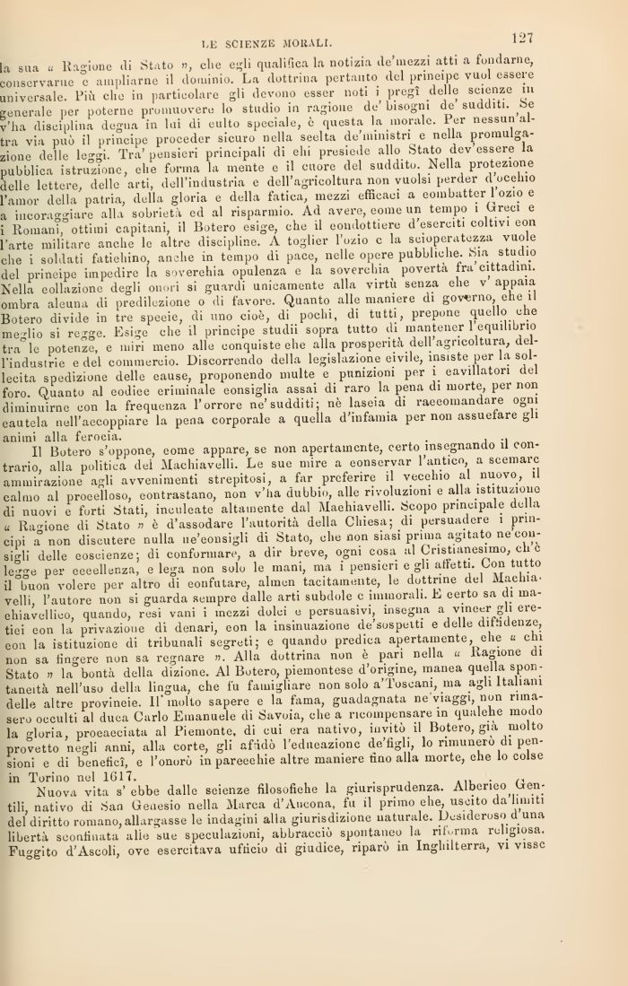 Il Botero s'oppone, eome appare, se non apertamente, certo insegnando U contrario, alla politica dei Machiavelli. Le sue mire a conservar l'antico a scemare ammirazione agli avvenimenti strepitosi, a far preferire il vecehio al nuovo, U calmo al procelloso, contrastano, non v'ha dubbio, alle rivoluzioni e alla istituzione di nuovi e forti Stati, inculcate altamente dal Machiavelli. Scopo principale della t Rao-ione di Stato » è d'assodare l'autorità della Chiesa; di persuadere i principi a non discutere nulla ue'eonsigli di Stato, ehe non siasi prima agitato ne conigli delle coscienze; di conformare, a dir breve, ogni cosa al Cristianesimo, eh c le -e per eeeellenza, e lega non solo le mani, ma i pensieri e gli affetti. Con tutto if buon volere per altro di confutare, almen tacitamente, le dottrine del Machiavelli l'autore non si guarda sempre dalle arti subdole c immorali. E eerto sa di ma-ehi «vellico, quando, resi vani i mezzi dolci e persuasivi, insegna a vincer gli ere-dei eon la privazione di denari, eon la insinuazione de'sospeiti e delle ditiidenze, eon la istituzione di tribunali segreti; e quando predica apertamente, ehe « chi non sa tìngere non sa regnare ». Alla dottrina non è pari nella « Kagione di Stato » la bontà della dizione. Al Botero, piemontese d'origine, manea quella spontaneità nell'uso della lingua, che fu famigliare non solo a'Toscani, ma agli Italiani delle altre provineie. lf molto sapere e la fama, guadagnata ne viaggi, non rimasero occulti al duca Carlo Emanuele di Savoia, che a ricompensare in qualehe modo la gloria, proeaeciata al Piemonte, di cui era nativo, invitò il Botero, già molto itovetto negli anni, alla corte, gli afddò l'edueazionc de'figli, lo rimunero di pensioni e di benefici, e l'onorò inpareeehie altre maniere fino alla morte, ehe lo colse