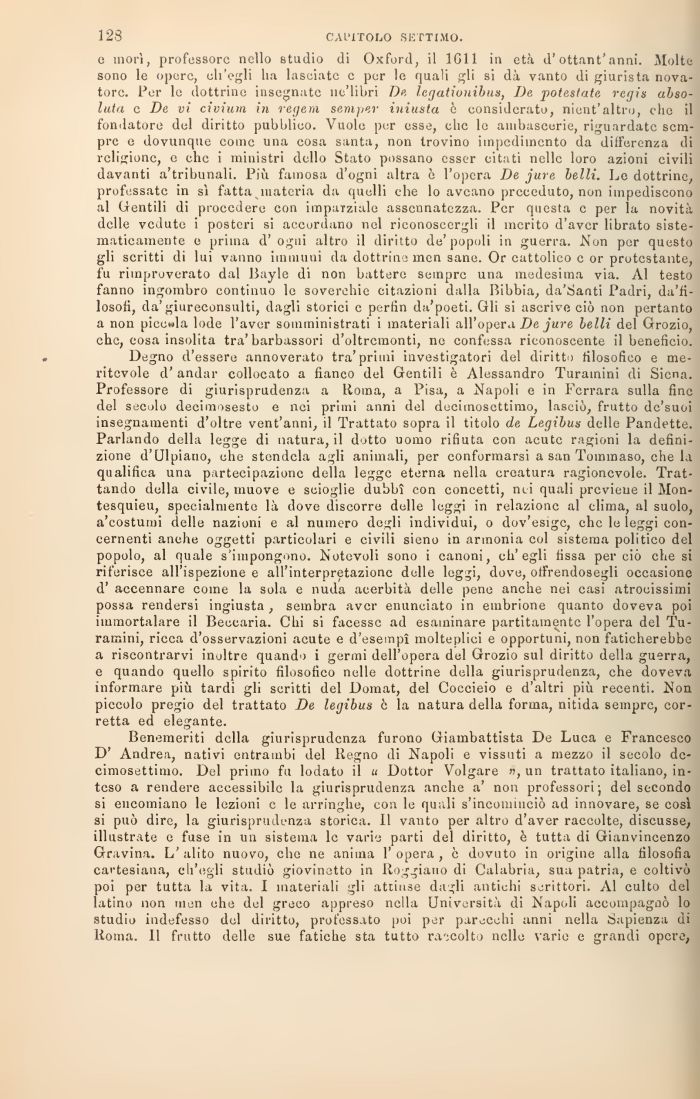 Degno d'essere annoverato tra'primi investigatori del diritto filosofico e meritevole d' andar collocato a fianco del Gentili è Alessandro Turainini di Siena. Professore di giurisprudenza a Roma, a Pisa, a Napoli e in Ferrara sulla fine del secolo decimosesto e nei primi anni del deciinosettimo, lasciò, frutto de'suoi insegnamenti d'oltre vent'anni, il Trattato sopra il titolo de Legibua delle Pandette. Parlando della legge di natura, il dotto uomo rifiuta con acute ragioni la definizione d'LJlpiano, che stendcla agli animali, per conformarsi a san Tommaso, che li qualifica una partecipazione della legge eterna nella creatura ragionevole. Trattando della civile, muove e scioglie dubbi con concetti, nei quali previene il Montesquieu, specialmente là dove discorre delle leggi in relazione al clima, al suolo, a'eostumi delle nazioni e al numero degli individui, o dov'esige, clic le ieggi concernenti anehe oggetti particolari e civili sieno in armonia col sistema politico del popolo, al quale s'impongono. Notevoli sono i canoni, ch'egli fissa perciò che si riferisce all'ispezione e all'interpretazione delle leggi, dove, offrendosegli occasione d' accennare come la sola e nuda acerbità delle pene anche nei casi atrocissimi possa rendersi ingiusta , sembra aver enunciato in embrione quanto doveva poi immortalare il Beccaria. Chi si facesse ad esaminare paratamente l'opera del Tu-ramini, ricca d'osservazioni acute e d'esempi molteplici e opportuni, non faticherebbe a riscontrarvi inoltre quando i germi dell'opera del Grozio sul diritto della guerra, e quando quello spirito filosofico nelle dottrine della giurisprudenza, ehe doveva informare più tardi gli scritti del Domat, del Coccieio e d'altri più recenti. Non piccolo pregio del trattato De legibus c la natura della forma, nitida sempre, corretta ed elegante.
