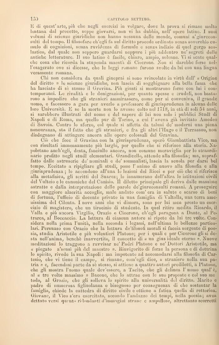 Chi non considera da quali gineprai si sono svincolate in virtù dell' « Origine del diritto » le seienze giuridiche, non lascia di sogghignare alla bella fama chc ha lasciato di se stesso il Gravina. Più giusti si mostrarono forse con lui i eonl temporanei. Le rivalità e le denigrazioni, per quanto spesse e crudeli, non bastarono a impedire ehe gli stranieri ammirassero, eome pur si conveniva, il grande uomo, e facessero a gara per averlo a professore di giurisprudenza in alcuna delle loro Università. E se la morte non lo avesse colto nel 1718, in età di soli 51 anni, si sarebbero illustrati del nome e del sapere di lui non solo i pubblici Studi (li Napoli e di Roma, ma quello pur di Torino, a cui l'aveva già invitato Amedeo di Savoia. Contro lo sforzo, col quale si affetta da taluni de' moderni una piena noncuranza, sta il fatto che gli stranieri, e fra gli altri l'Hugo e d Terrassou, non disdegnano di attingere ancora alle opere colossali del Gravina.