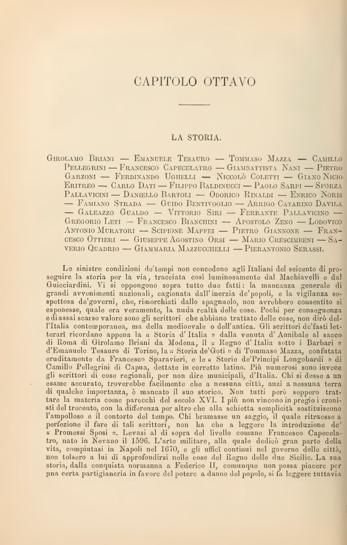 Le sinistre condizioni de'tempi non concedono agli Italiani del seicento di proseguire la storia per la via, tracciata così luminosamente dal Machiavelli e dal Guicciardini. Vi si oppongono sopra tutto due fatti: la mancanza generale di grandi avvenimenti nazionali, cagionata dall'inerzia dc'popoli, e la vigilanza sospettosa de'governi, che, rimorchiati dallo spagnuolo, non avrebbero consentito si esponesse, quale era veramente, la nuda realtà delle cose. Pochi per conseguenza e di assai scarso valore sono gli scrittori che abbiano trattato delle cose, non dirò dell'Italia contemporanea, ma della medioevale o dell'antica. Gli scrittori dc'fasti letterari ricordano appena la ti Storia d'Italia » dalla venuta d' Annibale al sacco di Roma di Girolamo Briani da Modena, il te Regno d' Italia sotto i Barbari » d'Emanuele Tesauro di Torino, la a Storia de'Goti » di Tommaso Mazza, confutata eruditamente da Francesco Sparavieri, e le « Storie de'Principi Longobardi » di Camillo Pellegrini di Capua, dettate in corretto latino. Più numerosi sono invece gli scrittori di cose regionali, per non dire municipali, d'Italia. Chi si desse a un esame accurato, troverebbe facilmente che a nessuna città, anzi a nessuna terra di qualche importanza, è mancato il suo storico. Non tutti però seppero trattare la materia come parecchi del secolo XVI. I più non vincono in pregio i cronisti del trecento, con la differenza per altro che alla schietta semplicità sostituiscono l'ampolloso e il contorto del tempo. Chi bramasse un saggio, d quale ritraesse a perfezione il fare di tali scrittori, non ha che a leggere la introduzione de' ti Promessi Sposi ». Levasi al di sopra del livello comune Francesco Capecelatro, nato in Nevano il 159G. L'arte militare, alla quale dedicò gran parte della vita, compiutasi in Napoli nel 1670, e gli uffici continui nel governo delle città, non tolsero a lui di approfondirsi nelle cose del Regno delle due Sicibc. La sua storia, dalla conquista normanna a Federico II, comunque non possa piacere per jina certa partigianeria in favore del potere a danno del popolo, si fa leggere tuttavia