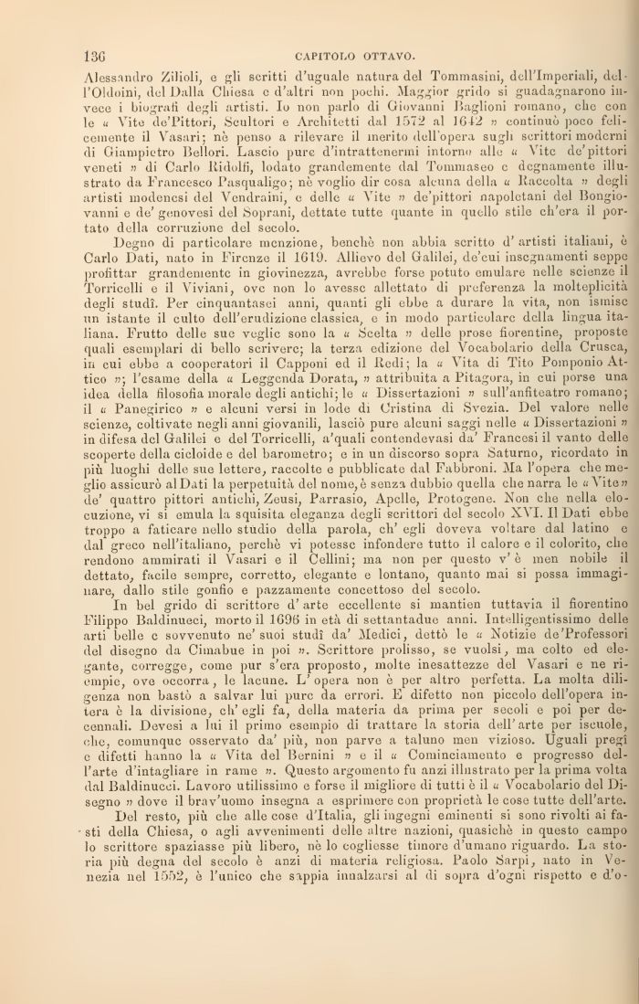 Degno di particolare menzione, benché non abbia scritto d' artisti italiani, è Carlo Dati, nato in Firenze il 1619. Allievo del Galilei, de'cui insegnamenti seppe profittar grandemente in giovinezza, avrebbe forse potuto emulare nelle scienze il Torricelli e il Viviani, ove non lo avesse allettato di preferenza la molteplicità degli studi. Per cinquantasei anni, quanti gli ebbe a durare la vita, non ismise un istante il culto dell'erudizione classica, e in modo particolare della lingua italiana. Frutto delle sue veglie sono la u Scelta » delle prose fiorentine, proposte quali esemplari di bello scrivere; la terza edizione del Vocabolario della Crusca, in cui ebbe a cooperatori il Capponi ed il Redi; la u Vita di Tito Pomponio Attico »; l'esame della u Leggenda Dorata, » attribuita a Pitagora, in cui porse una idea della filosofia morale degli antichi; le u Dissertazioni » sull'anfiteatro romano; il u Panegirico » e alcuni versi in lode di Cristina di Svezia. Del valore nelle scienze, coltivate negli anni giovanili, lasciò pure alcuni saggi nelle « Dissertazioni » in difesa del Galilei e del Torricelli, a'quali contendevasi da' Francesi il vanto delle scoperte della cicloide e del barometro; e in un discorso sopra Saturno, ricordato in più luoghi delle sue lettere, raccolte e pubblicate dal Fabbroni. Ma l'opera che meglio assicurò al Dati la perpetuità del nome, è senza dubbio quella che narra le «Vite» de' quattro pittori antichi, Zeusi, Parrasio, Apclle, Protogene. Non che nella elocuzione, vi si emula la squisita eleganza degli scrittori del secolo XVI. Il Dati ebbe troppo a faticare nello studio della parola, eh' egli doveva voltare dal latino e dal greco nell'italiano, perchè vi potesse infondere tutto il calore e il colorito, che rendono ammirati il Vasari e il Cellini; ma non per questo v' è men nobile il dettato, facile sempre, corretto, elegante e lontano, quanto mai si possa immaginare, dallo stile gonfio e pazzamente concettoso del secolo.