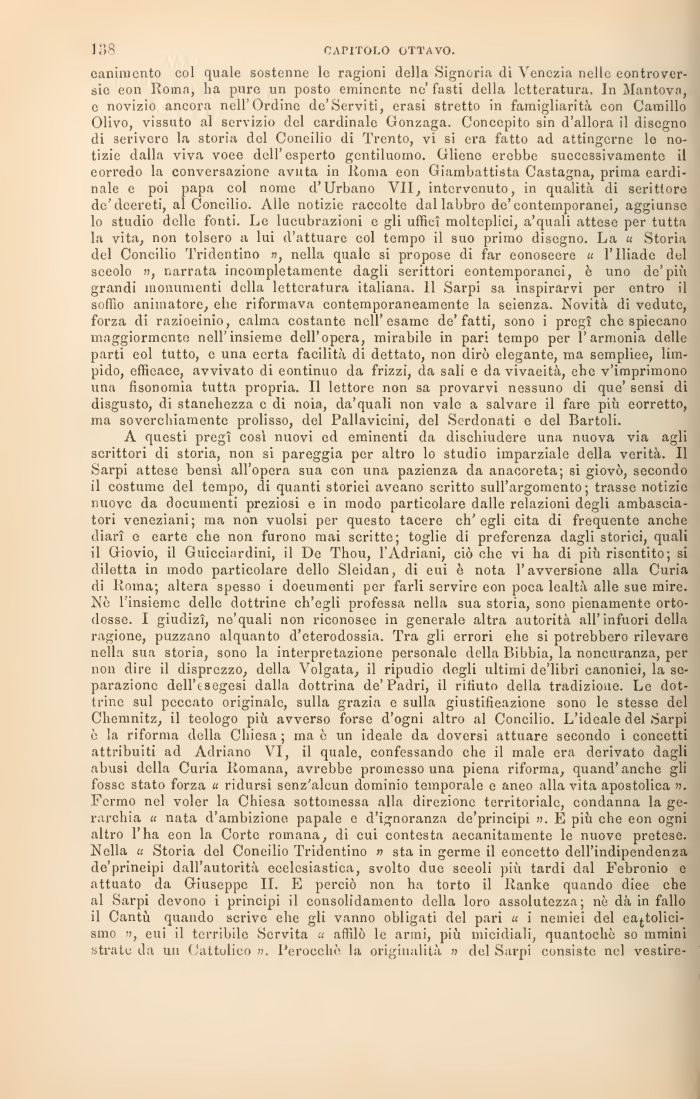 eanimento col quale sostenne le ragioni della Signoria di Venezia nelle eontrover-sie eon Roma, li a pure un posto eminente ne' fasti della letteratura. In Mantova, e novizio ancora nell Ordine de'Serviti, erasi stretto in famigliarità con Camillo Olivo, vissuto al servizio del cardinale Gonzaga. Concepito sin d'allora il disegno di serivero la storia del Coneilio di Trento, vi si era fatto ad attingerne lo notizie dalla viva voee dell'esperto gentiluomo. Gliene erebbe suecessivamento il eorredo la conversazione avuta in Roma eon Giambattista Castagna, prima cardinale e poi papa col nome d'Urbano VII, intervenuto, in qualità di scrittore de'deereti, al Concilio. Alle notizie raccolte dal labbro de'contemporanei, aggiunse
