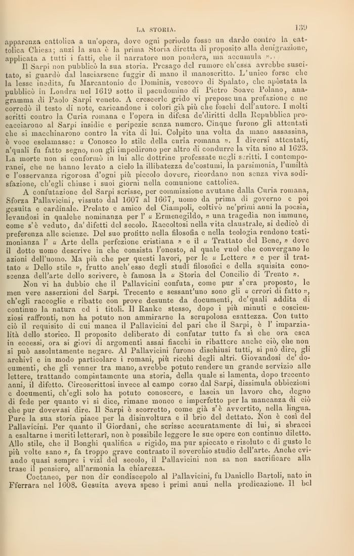 Non vi ha dubbio che il Pallavicini eonfuta, come pur s'era proposto, le men vere asserzioni del Sarpi. Trecento e sessant'uno sono gli « errori di fatto », ch'egli raceoglie e ribatte eon prove desunte da documenti, de'quali addita^ di continuo la natura ed i titoli. Il Ranke stesso, dopo i più minuti e eoscien-ziosi raffronti, non ha potuto non ammirarne la scrupolosa esattezza. Con tutto ciò il requisito di cui manca il Pallavicini del pari che il Sarpi, è 1' imparzialità dello storico. Il proposito deliberato di confutar tutto fa sì ehe^ ora esca in eeeessi, ora si giovi di argomenti assai fiacchi in ribattere anche eiò, elle non si può assolutamente negare. Al Pallavicini furono dischiusi tutti, si può dire, gli archivi e in modo particolare i romani, più rieehi degli altri. Giovandosi de' documenti, che gli venner tra mano, avrebbe potuto rendere un grande servizio alle lettere, trattando compiutamente una storia, della quale si lamenta, dopo treeento anni, il difetto. Cireoserittosi inveee al campo corso dal Sarpi, dissimula obbiezioni c documenti, ch'egli solo ha potuto conoscere, e laseia un lavoro chc, dpgno di fede per quanto vi si dice., rimane moneo e imperfetto per la maneanza di eiò che pur dovevasi dire. Il Sarpi è scorretto, come già s'è avvertito, nella lingua. Pure la sua storia piaee per la disinvoltura e il brio del dettato. Non è così del Pallavicini. Per quanto il Giordani, che scrisse aceuratamente di lui, si sbraeei a esaltarne i meriti letterari, non è possibile leggere le sue opere con continuo diletto. Allo stile, ehe il Bonghi qualifica u rigido, ma pur spiecato e risoluto c di gusto le più volte sano », fa troppo grave contrasto il soverchio studio dell arte. Anehe cvi-ando quasi sempre i vizi del seeolo, il Pallavicini non sa non sacrificare alla trase il pensiero, all'armonia la chiarezza.