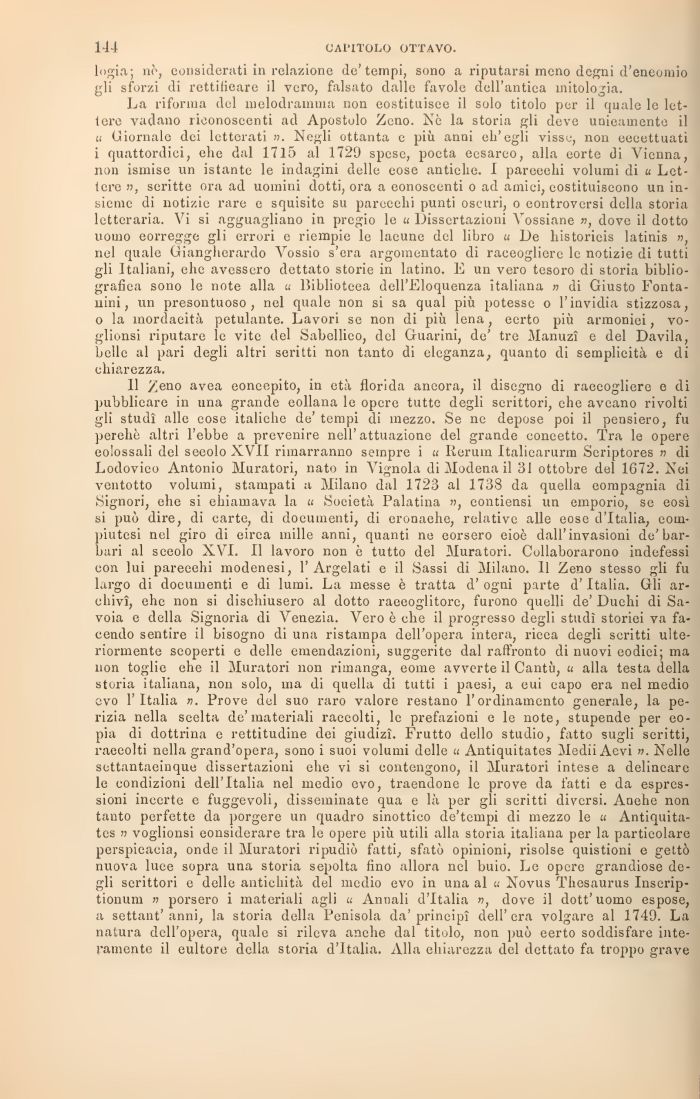 Il Zeno avea concepito, in età florida ancora, il disegno d raccogliere e di pubblicare in una grande eollana le opere tutte degli scrittori, ehe aveano rivolti gli studi alle cose italiche de' tempi di mezzo. Se ne depose poi il pensiero, fu perehò altri l'ebbe a prevenire nell'attuazione del grande concetto. Tra le opere colossali del seeolo XVII rimarranno sempre i u Rerum Italiearurm Se/iptorcs » di Lodovico Antonio Muratori, nato in Vignola di Modena il 31 ottobre del 1G72. Nei ventotto volumi, stampati a Milano dal 1723 al 1738 da quella compagnia di Signori, ehe si chiamava la u Società Palatina », eontiens: un emporio, se eosì si può dire, di carte, di documenti, d eronaehe, relative alle eose d'Italia, compiutesi nel giro di eirea mille anni, quanti ne eorsero eioè dall'invasioni de'barbari al seeolo XVI. Il lavoro non è tutto del Muratori. Collaborarono indefessi con lui pareeehi modenesi, 1'Argelati e il Sassi di Milano. Il Zeno stesso gli fu largo di documenti e di lumi. La messe è tratta d'ogni parte d'Italia. Gli archivi, ehe non si dischiusero al dotto raeeoglitore, furono quelb' de' Duchi di Savoia e della Signoria di Venezia. Vero è che d progresso degl studi storici va facendo sentire il bisogno di una ristampa dell'opera intera, ricca degli scritti ulteriormente scoperti e delle emendazioni, suggerite dal raffronto di nuovi eodiei; ma non toglie ehe il Muratori non rimanga, eome avverte il Cantù, u alla testa della storia italiana, non solo, ma di quella di tutti i paesi, a eui capo era nel medio evo l'Italia ». Prove del suo raro valore restano l'ordinamento generale, la perizia nella scelta de'materiali raccolti, le prefazioni e le note, stupende per copia di dottrina e rettitudine dei giudizi. Frutto dello studio, fatto sugli ser