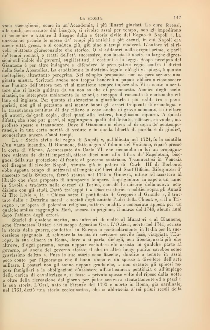 La ii Storia civile del regno di Napoli », pubblicata nel 1724, fu la scintilla d'un vasto incendio. Il Giannone, fatto segno a' fulmini del Vaticano, riparò presso la corte di Vienna. Accarezzato da Carlo VI, che riconobbe in lui un propugnatore valente de' diritti imperiali, attese dieci anni alla difesa de' Napoletani, bisognosi della sua protezione di fronte al governo austriaco. Tramutatosi in Venezia col disegno di riveder Napoli, venuta già in potere di Carlo III di Borbonei ebbe appena tempo di sottrarsi all'unghie de' birri del Sant'Ufficio. Rifugiatosi d< nascosto nella Svizzera, fermò stanza nel 1745 a Ginevra, inteso ad assistere al libraio che s'era proposto di stamparne le opere. Imprigionato in capo a un anno in Savoia e tradotto nelle carceri di Torino, consolò le miserie della nuova condizione con gli studi. Dettò tra'ceppi i a Discorsi storici e politici sopra gli Annali di Tito Livio », la ii Chiesa sotto il pontificato di Gregorio il Grande », il trattato delle u Dottrine morali e sociali degli antichi Padri della Chiesa », e il « Triregno », un'opera di polemica religiosa, tuttora inedita e conosciuta appena per un qualche smilzo ragguaglio. Morì, ancora in prigione, il marzo del 1748, alcuni anni dopo l'abiura degli errori.