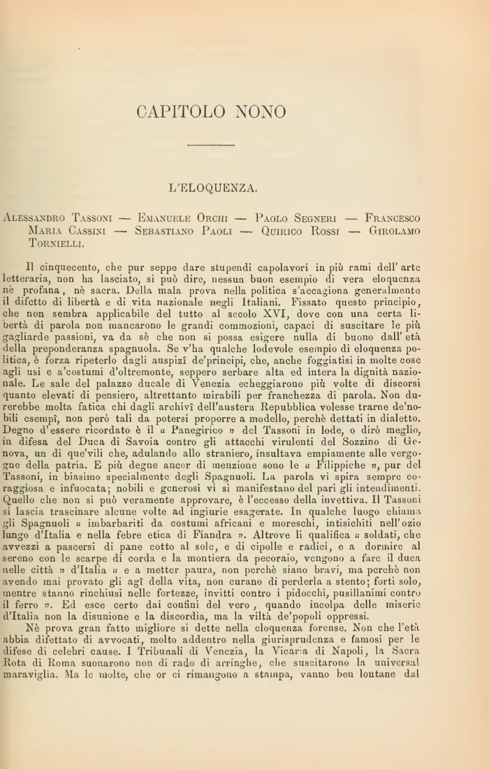 Il cinquecento, che pur seppe dare stupendi capolavori in più rami dell' arte letteraria, non ha lasciato, si può dire, nessun buon esempio di vera eloquenza né profana, nò saera. Della mala prova nella politica s'accagiona generalmente il difetto di libertà e di vita nazionale negli Italiani. Fissato questo principio, che non sembra applicabile del tutto al secolo XVI, dove con una certa libertà di parola non mancarono le grandi commuzioni, capaci di suscitare le più gagliarde passioni, va da se che non si possa esigere nulla di buono dall' età della preponderanza spagnuola. Se v'ha qualche lodevole esempio di eloquenza politica, è forza ripeterlo dagli auspizì de'principi, che, anche foggiatisi in molte cose agli usi c a'eostumi d'oltremonte, seppero serbare alta ed intera la dignità nazionale. Le sale del palazzo ducale di Venezia echeggiarono più volte di discorsi quanto elevati di pensiero, altrettanto mirabili per franchezza di parola. Non durerebbe molta fatica chi dagli archivi dell'austera Repubblica volesse trarne de'no-bil esempi, non però tali da potersi proporre a modello, perchè dettati in dialetto. Degno d'essere ricordato è il u Panegirico » del Tassoni in lode, o dirò meglio, in difesa del Duca di Savoia contro gli attacchi virulenti. del Sozzino di Genova, un di que'vili che, adulando allo straniero, insultava empiamente alle vergogne della patria. E più degne ancor di menzione sono le « Filippiche », pur del Tassoni in biasimo specialmente degli Spagnuoli. La parola vi spira sempre coraggiosa e infuocata; nobili e generosi vi si manifestano del pari gli intendimenti. Quello che non si può veramente approvare, è l'eccesso della invettiva. Il Tassoni sì lascia trascinare alcune volte ad ingiurie esagerate. In qualche luogo chiama gli Spagnuoli u imbarbariti da costumi african e moreschi, intisichiti nell'ozio lungo d'Italia e nella febre etica di Fiandra ». Altrove li qualifica u soldati, che avvezz a pascersi di pane cotto al sole, e di cipolle e radici, e a dormire al sereno con le scarpe di corda e la montiera da pecoraio, vengono a fare il duca nelle città » d'Italia « e a metter paura, non perchè siano bravi, ma perchè non avendo mai provato gli agì della vita, non curano di perderla a stento; forti solo, mentre stanno rinchiusi nelle fortezze, invitti contro i pidocchi, pusillanimi contro il ferro ». Ed esce certo dai confini del vero , quando incolpa delle miserie d'Italia non la disunione e la discordia, ma la v>ltà de'popoli oppressi.
