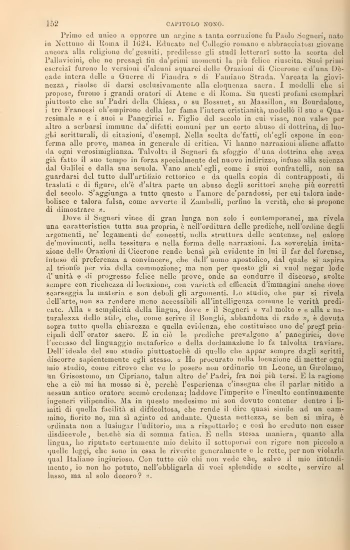 Primo ed unico a opporre un argine a tanta corruzione fu Paolo Segneri, nato in Nettuno di Roma il 1 (321. Educato nel Collegio romano e abbracciatosi giovane ancora alla religione de' gesiiit i, predilesse gli studi letterari sotto la scorta del Pallavicini, clic ne presagi tin da'pnmi momenti la più felice riuscita. Suoi primi esercizi furono le versioni d'alcuni squarci delle Orazioni di Cicerone e d'una Dècade intera delle u Guerre di Fiandra » di Faniiano Strada. Varcata la giovinezza, risolse di darsi esclusivamente alla eloquenza sacra. I modcll clic si propose, furono i grandi oratori di Atene c di Roma. Su questi profani esemplari piuttosto che su'Padri della Chiesa, o su Bossuet, su Massillon, su Bourdalouc, i tre Francesi ch'empirono della lor faina l'intera enstianità, modellò il suo u Quaresimale » e i suoi u Panegirici ». Figlio del secolo in cui visse, non valse per altro a serbarsi immune da' difetti comuni per un eerto abuso di dottrina, di luoghi scritturali, di citazioni, d'esempi. Nella scelta de'fatti, ch'egli espone in conferma alle prove, manca in generale di critica. Vi hanno narrazioni aliene affatto da ogni verosimiglianza. Talvolta d Segneri fa sfoggio d'una dottrina ehe avea già fatto il suo tempo in forza specialmente del nuovo indirizzo, infuso alla scienza dal Galilei e dalla sua scuola. Vano anch'egli, come i suoi confratelli, non sa guardarsi del tutto dall'artifizio rettorico e da quella copia di contrapposti, di traslati e di figure, eli'è d'altra parte un abuso degli scrittori anche più corretti del secolo. S'aggiunga a tutto questo u l'amore de'paradossi, per cui talora indebolisce e talora falsa, come avverte d Zambell:, perfino la verità, ehe si propone di dimostrare ».