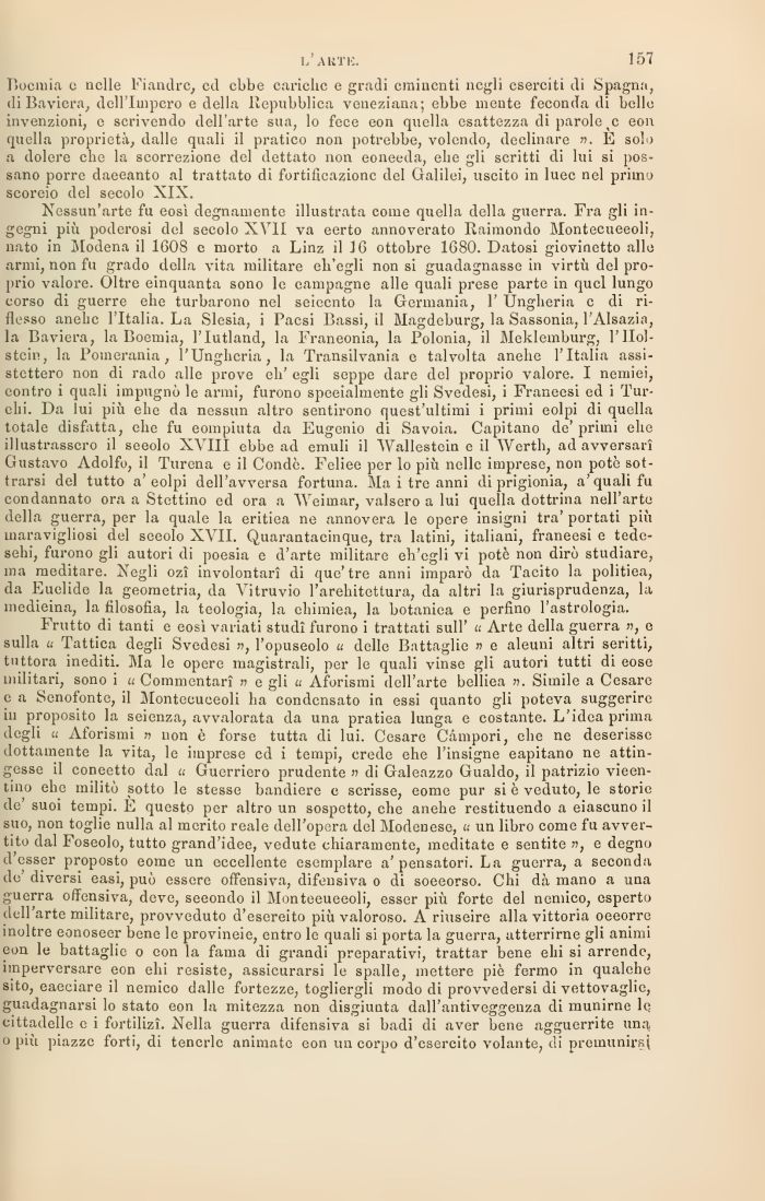 Nessun'arte fu eosì degnamente illustrata come quella della guerra. Fra gli ingegni più poderosi del secolo XVII va eerto annoverato Raimondo Montecueeoli, nato in Modena il 1008 e morto a Linz il J 6 ottobre 1680. Datosi giovinetto alle armi, non fu grado della vita militare eh'egli non si guadagnasse in virtù del proprio valore. Oltre cinquanta sono le campagne alle quali prese parte in quel lungo corso di guerre ehe turbarono nel seicento la Germania, 1' Ungheria e di riflesso anehe l'Italia. La Slesia, i Paesi Bassi, il Magdeburg, la Sassonia, l'Alsazia, la Baviera, la Boemia, l'Iutland, la Franeonia, la Polonia, il Meklemburg, l'IIol-stein, la Pomerania , l'Ungheria, la Transilvania e talvolta anehe l'Italia assistettero non di rado alle prove eli' egli seppe dare del proprio valore. I nemiei, eontro i quali impugnò le armi, furono speeialmente gli Svedesi, i Franeesi ed i Turchi. Da lui più ehe da nessun altro sentirono quest'ultimi i primi eolpi di quella totale disfatta, ehe fu eompiuta da Eugenio di Savoia. Capitano de' primi ehe illustrassero il seeolo XVIII ebbe ad emuli il Wallestein e il Werth, ad avversari Gustavo Adolfo, il Turena e il Condè. Feliee per lo più nelle imprese, non potè sottrarsi del tutto a'eolpi dell'avversa fortuna. Mal i tre anni di prigionia, a'quali fu condannato ora a Stettino ed ora a 'Weimar, valsero a lui quella dottrina nell'arte della guerra, per la quale la eritiea ne annovera le opere insigni tra' portati più inaravigliosi del seeolo XVII. Quarantacinque, tra latini, italiani, franeesi e tede-sebi, furono gli autori di poesia e d'arte militare eh'egli vi potè non dirò studiare, ma meditare. Negli ozi involontari di que'tre anni imparò da Tacito la politiea, da Euclide la geometria, da Vitruvio l'arehitettura, da altri la giurisprudenza, la medieina, la filosofia, la teologia, la eliimiea, la botanica e perfino l'astrologia.