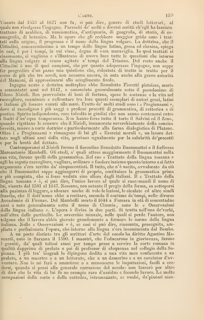 Contemporanei al Nisicli furono il fiorentino Benedetto Buommattci e il forlivese Marcantonio Mainbclli. Gli studi, a' quali atteso maggiormente il Buommattei nella sua vita, furono quelli della grammatica. Nel suo u Trattato della lingua toscana » egli ha saputo raccogliere, vagliare, ordinare e fondere insieme quanto intorno a si fatto argomento s'era scritto da' cinquecentisti. Il tutto, che n'è uscito, avvalorato da ciò clic il Buommattci seppe aggiungervi di proprio, costituisce la grammatica prima e più compiuta, che si fosse veduta sino allora dagli italiani, il u Trattato della lingua toscana » è, si può dire, l'unico lavoro al quale si raccomandi il nome di lui, vissuto dal 1581 al 1647. Nessuno, non ostante il pregio della forma, sa sottoporsi alla pazienza di leggere, o sfiorare anche di volo le lezioni, le cicalate ed altre simili frasche, che il dott'uomo ebbe a recitare, secondo il costume de'tempi, nelle diverse Accademie di Firenze. Del Mambclli morto il 1644 a Ferrara in età di sessantaduc anni e noto generalmente sotto il nome di Cinonio, sono le u Osservazioni della lingua italiana ». L'opera è divisa in due parti. Si tratta nell'una de'vcrbi, nelì'altra delle particelle. Le soverchie minuzie, nelle quali si perde l'autore, non tolgono che il lavoro abbia giovato grandemente a fermare le norme della lingua italiana. Nelle u Osservazioni » è, se così si può dire, riassunta, proseguita, ampliata e perfezionata l'opera, che intorno alla lingua s'era incominciata dal Bembo.