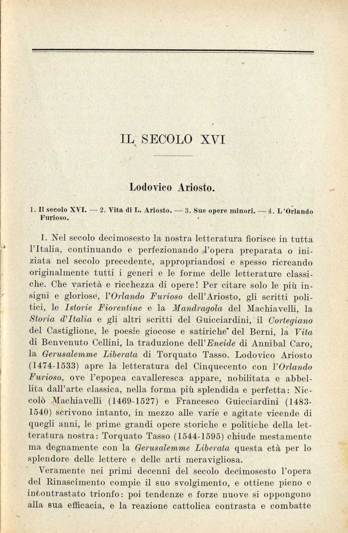 1. Nel secolo decimosesto la nostra letteratura fiorisce in tutta l'Italia, continuando e perfezionando l'opera preparata o iniziata nel secolo precedente, appropriandosi e spesso ricreando originalmente tutti i generi e le forme delle letterature classiche. Che varietà e ricchezza di opere ! Per citare solo le più insigni e gloriose, l'Orlando Furioso dell'Ariosto, gli scritti politici, le Istorie Fiorentine e la Mandragola del Machiavelli, la Storia d'Italia e gli altri scritti del Guicciardini, il Cortegiano del Castiglione, le poesie giocose e satiriche* del Berni, la Vita di Benvenuto Celimi, la traduzione dell 'Eneide di Annibal Caro, la Gerusalemme Liberata di Torquato Tasso. Lodovico Ariosto (1474-1533) apre la letteratura del Cinquecento con l'Orlando Furioso, ove l'epopea cavalleresca appare, nobilitata e abbellita dall'arte classica, nella forma più splendida e perfetta: Niccolò Machiavelli (1469-1527) e Francesco Guicciardini (1483-1540) scrivono intanto, in mezzo alle varie e agitate vicende di quegli anni, le prime grandi opere storiche e politiche della letteratura nostra: Torquato Tasso (1544-1595) chiude mestamente ma degnamente con la Gerusalemme Liberata questa età per lo splendore delle lettere e delle arti meravigliosa.