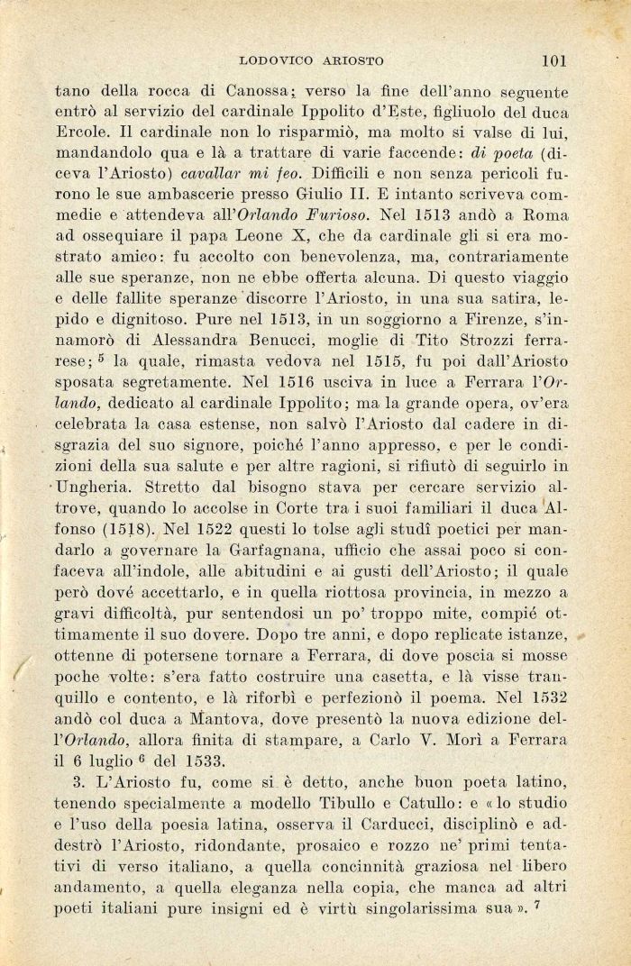 3. L'Ariosto fu, come sL è detto, anche buon poeta latino, tenendo specialmente a modello Tibullo e Catullo : e « lo studio e l'uso della poesia latina, osserva il Carducci, disciplinò e addestrò l'Ariosto, ridondante, prosaico e rozzo ne' primi tentativi di verso italiano, a. quella concinnità graziosa nel libero andamento, a quella eleganza nella copia, che manca ad altri poeti italiani pure insigni ed è virtù singolarissima sua ». 7