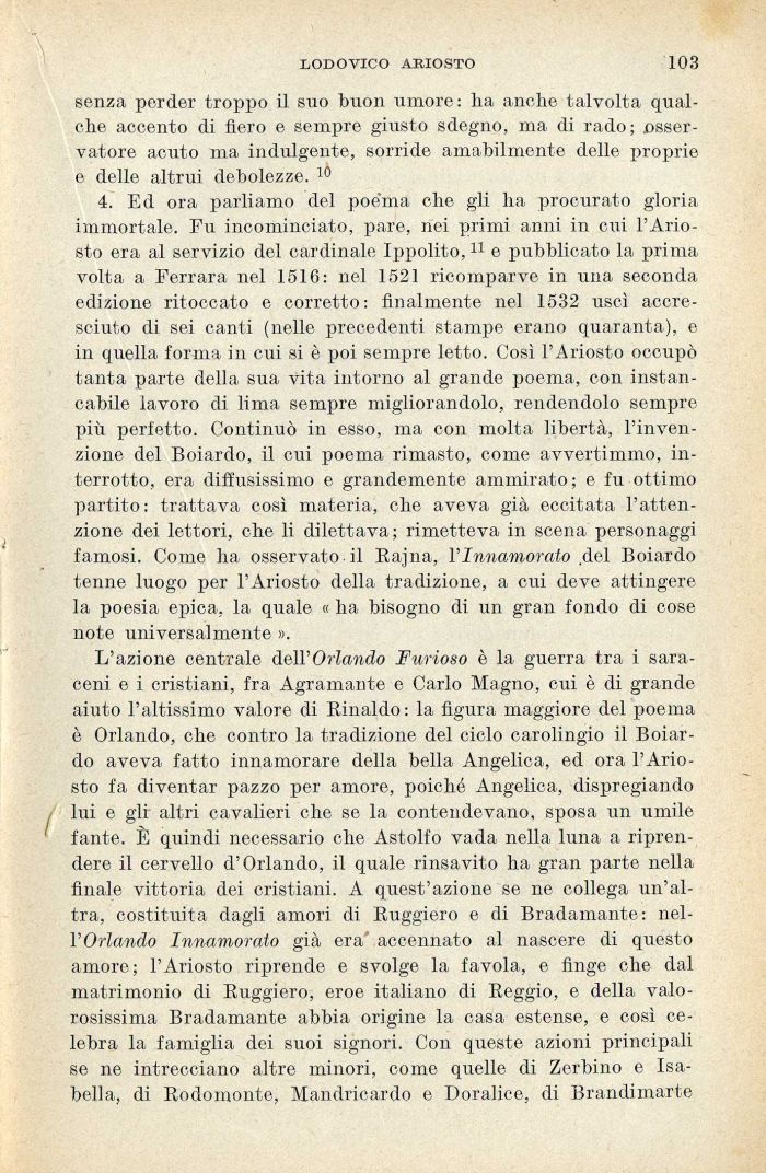 4. Ed ora parliamo del poe'ma ohe gli ha procurato gloria immortale. Fu incominciato, pare, nei primi anni in cui l'Ariosto era al servizio del cardinale Ippolito,11 e pubblicato la prima volta a Ferrara nel 1516: nel 1521 ricomparve in una seconda edizione ritoccato e corretto: finalmente nel 1532 uscì accresciuto di sei canti (nelle precedenti stampe erano quaranta), e in quella forma in cui si è poi sempre letto. Così l'Ariosto occupò tanta parte della sua vita intorno al grande poema, con instancabile lavoro di lima sempre migliorandolo, rendendolo sempre più perfetto. Continuò in esso, ina con molta libertà, l'invenzione del Boiardo, il cui poema rimasto, come avvertimmo, interrotto, era diffusissimo e grandemente ammirato; e fu ottimo partito: trattava così materia, che aveva già eccitata l'attenzione dei lettori, che li dilettava; rimetteva in scena personaggi famosi. Come ha osservato il Rajna, l'Innamorato .del Boiardo tenne luogo per l'Ariosto della tradizione, a cui deve attingere la poesia epica, la quale « ha bisogno di un gran fondo di cose note universalmente ».
