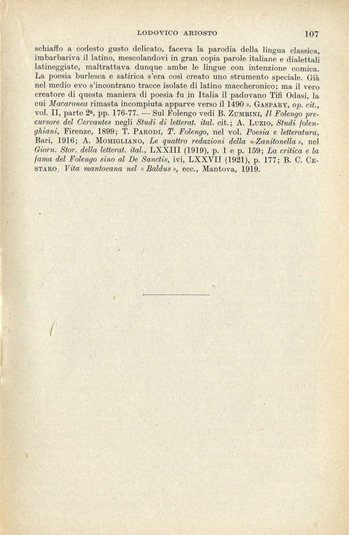 schiaffo a codesto gusto delicato, faceva la parodia della lingua classica, imbarbariva il latino, mescolandovi in gran copia parole italiane e dialettali latineggiate, maltrattava dunque ambe le lingue con intenzione comica. La poesia burlesca e satirica s'era così creato uno strumento speciale. Già nel medio evo s'incontrano tracce isolate di latino maccheronico; ma il vero creatore di questa maniera di poesia fu in Italia il padovano Tifi Odasi, la cui Macaronea rimasta incompiuta apparve verso il 1490 ». Gaspary, op. cit., voi. II, parte 2a, pp. 176-77. — Sul Folengo vedi B. Zumbini, Il Folengo precursore del, Cervantes negli Studi di letterat. ital. cit.; A. Luzio, Studi folen-ghiani, Firenze, 1899; T. Parodi, T. Folengo, nel voi. Poesia e letteratura, Bari, 1916; A. Momigliano, Le quattro redazioni della « Zanitonella », nel Giorn. Stor. della letterat. ital., LXXIII (1919), p. 1 e p. 159; La critica e la fama del Folengo sino al De Sanctis, ivi, LXXVII (1921), p. 177; B. C. Ce-staro. Vita mantovana nel « Baldus », ecc., Mantova, 1919.