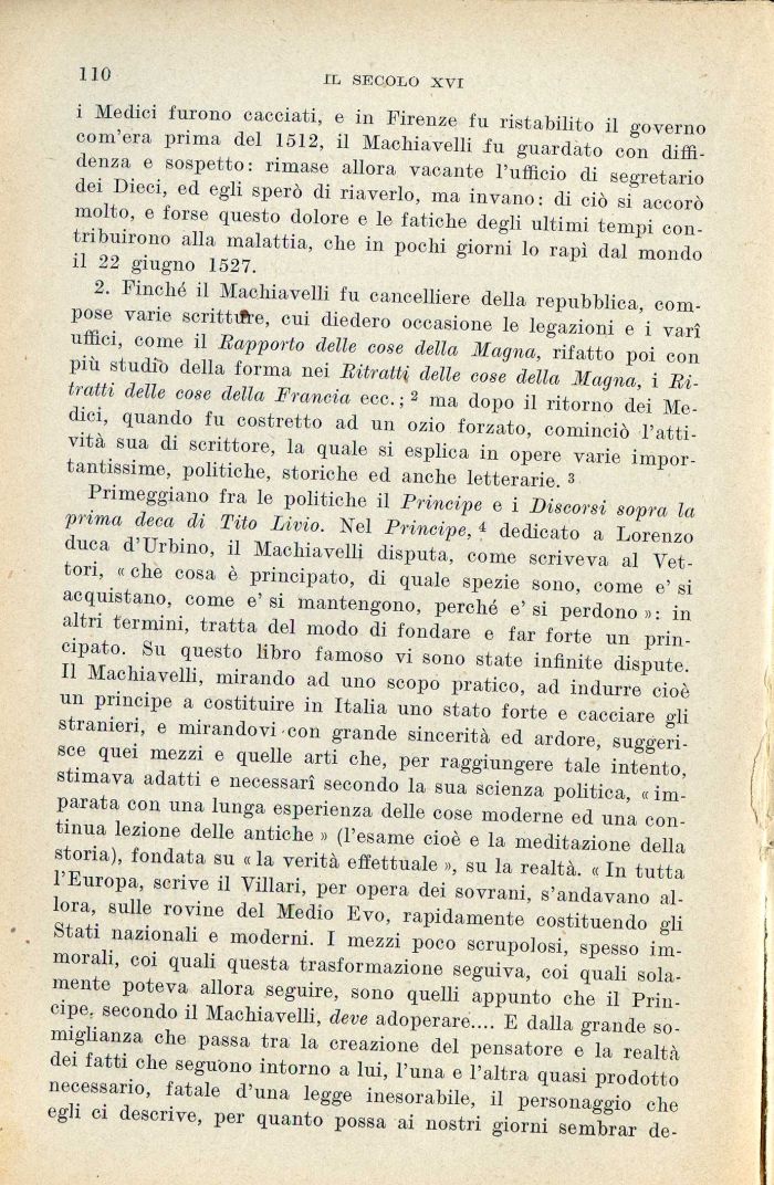 2. Finché il Machiavelli fu cancelliere della repubblica, compose varie scrittifre, cui diedero occasione le legazioni e i vari uffici, come il Rapporto delle cose della Magna, rifatto poi con più studio della forma nei Ritratti delle cose della Magna, i Ritratti delle cose della Francia ecc. ; 2 ma dopo il ritorno dei Medici, quando fu costretto ad un ozio forzato, cominciò l'attività sua di scrittore, la quale si esplica in opere varie importantissime, politiche, storiche ed anche letterarie. 3