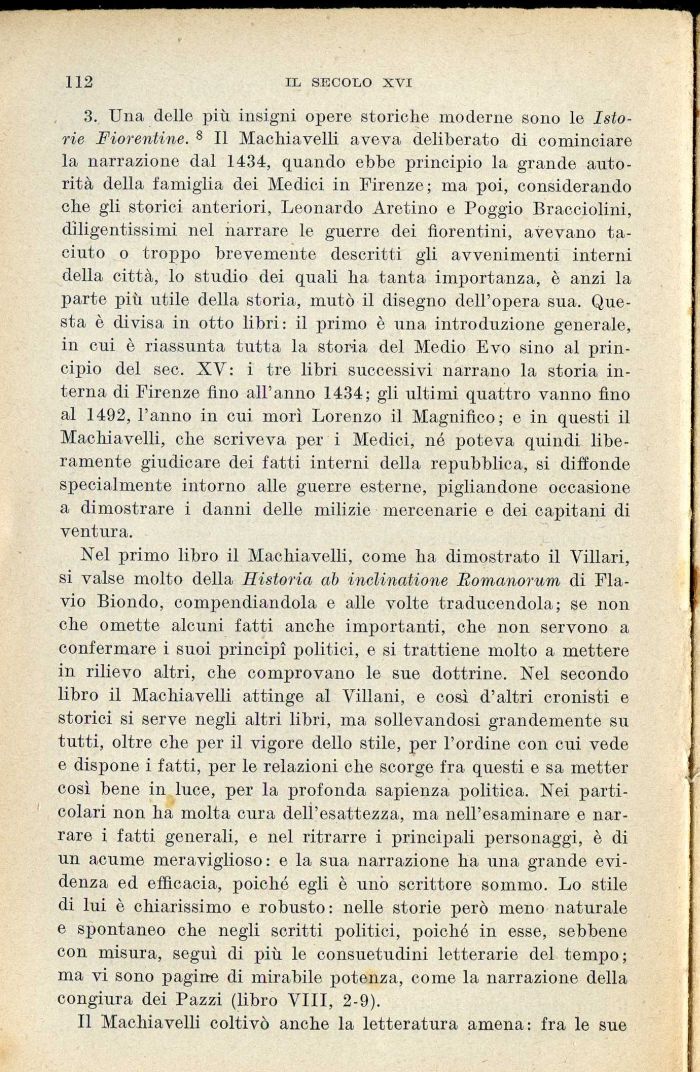 3. Una delle più insigni opere storiche moderne sono le Istorie Fiorentine. s II Machiavelli aveva deliberato di cominciare la narrazione dal 1434, quando ebbe principio la grande autorità della famiglia dei Medici in Firenze; ma poi, considerando che gli storici anteriori, Leonardo Aretino e Poggio Bracciolini, diligentissimi nel narrare le guerre dei fiorentini, avevano taciuto o troppo brevemente descritti gli avvenimenti interni della città, lo studio dei quali ha tanta importanza, è anzi la parte più utile della storia, mutò il disegno dell'opera sua. Questa è divisa in otto libri: il primo è una introduzione generale, in cui è riassunta tutta la storia del Medio Evo sino al principio del sec. XV: i tre libri successivi narrano la storia interna di Firenze fino all'anno 1434; gli ultimi quattro vanno fino al 1492, l'anno in cui morì Lorenzo il Magnifico; e in questi il Machiavelli, che scriveva per i Medici, né poteva quindi liberamente giudicare dei fatti interni della repubblica, si diffonde specialmente intorno alle guerre esterne, pigliandone occasione a dimostrare i danni delle milizie mercenarie e dei capitani di ventura.