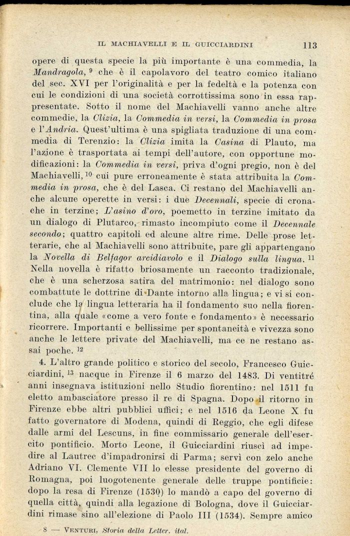 opere di questa specie la più importante è una commedia, la Mandragola, 9 che è il capolavoro del teatro comico italiano del sec. XVI per l'originalità e per la fedeltà e la potenza con cui le condizioni di una società corrottissima sono in essa rappresentate. Sotto il nome del Machiavelli vanno anche altre commedie, la Clizia, la Commedia in versi, la Commedia in prosa e VAndria. Quest'ultima è una spigliata traduzione di una commedia di Terenzio : la Clizia imita la Casina di Plauto, ma l'azione è trasportata ai tempi dell'autore, con opportune modificazioni: la Commedia in versi, priva d'ogni pregio, non è del Machiavelli,10 cui j)ure erroneamente è stata attribuita la Commedia in prosa, che è del Lasca. Ci restano del Machiavelli anche alcune operette in versi: i due Decennali, specie di cronache in terzine; L'asino d'oro, poemetto in terzine imitato da un dialogo di Plutarco, rimasto incompiuto come il Decennale secondo; quattro capitoli ed alcune altre rime. Delle prose letterarie, che al Machiavelli sono attribuite, pare gli appartengano la Novella di Belfagor arcidiavolo e il Dialogo sulla lingua. 11 Nella novella è rifatto briosamente un racconto tradizionale, che è una scherzosa satira del matrimonio: nel dialogo sono combattute le dottrine di Dante intorno alla lingua; e vi sì conclude che la lingua letteraria ha il fondamento suo nella fiorentina, alla quale «come a vero fonte e fondamento» è necessario ricorrere. Importanti e bellissime per spontaneità e vivezza sono anche le lettere private del Machiavelli, ma ce ne restano assai poche. 12