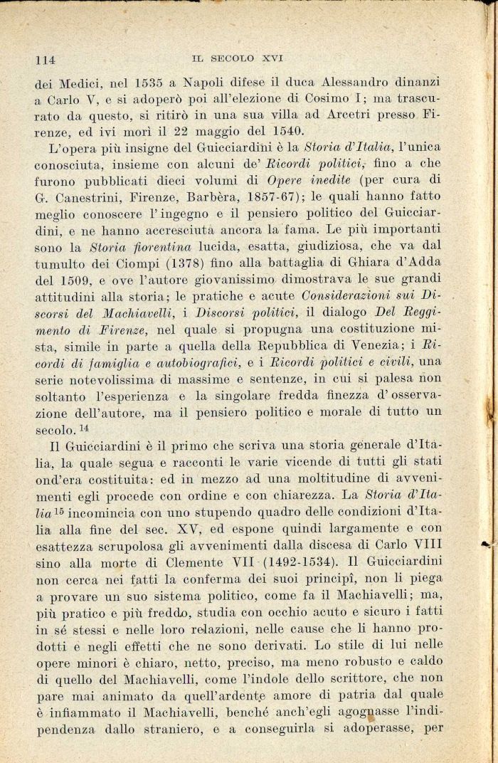 11 Guicciardini è il primo che scriva una storia generale d'Italia, la quale segua e racconti le varie vicende di tutti gli stati ond'era costituita: ed in mezzo ad una moltitudine di avvenimenti egli procede con ordine e con chiarezza. La Storia cl'Italia16 incomincia con uno stupendo quadro delle condizioni d'Italia alla fine del sec. XV, ed espone quindi largamente e con esattezza scrupolosa gli avvenimenti dalla discesa di Carlo VIII sino alla morte di Clemente VII (1492-1534). Il Guicciardini non cerca nei fatti la conferma dei suoi principi, non li piega a provare un suo sistema politico, come fa il Machiavelli; ma, più pratico e più fredcLo, studia con occhio acuto e sicuro i fatti in sé stessi e nelle loro relazioni, nelle cause che li hanno prodotti e negli effetti che ne sono derivati. Lo stile di lui nelle opere minori è chiaro, netto, preciso, ma meno robusto e caldo di quello del Machiavelli, come l'indole dello scrittore, che non pare mai animato da quell'ardente amore di patria dal quale è infiammato il Machiavelli, benché anch'egli agognasse l'indipendenza dallo straniero, e a conseguirla si adoperasse, per
