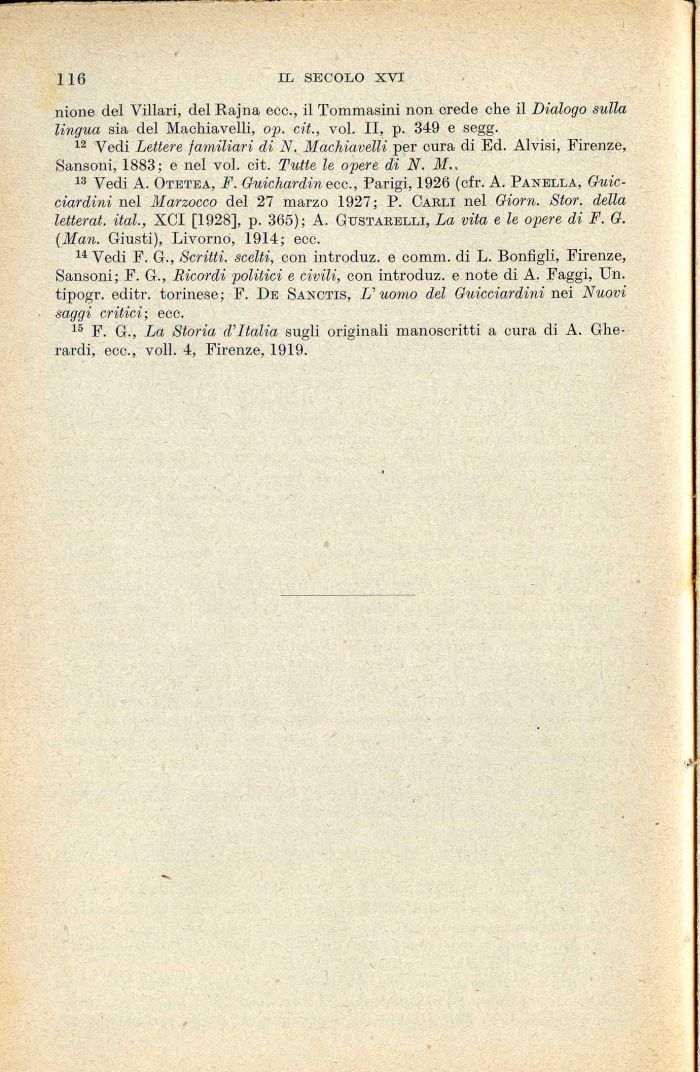 13 Vedi A. Otetea, F. Guichardinecc., Parigi, 1926 (cfr. A. Panella, Guicciardini nel Marzocco del 27 marzo 1927; P. Cabli nel Giorn. Stor. della letterat. ital., XCI [1928], p. 365); A. Gustarelli, La vita e le opere di F. G. (Man. Giusti), Livorno, 1914; ecc.