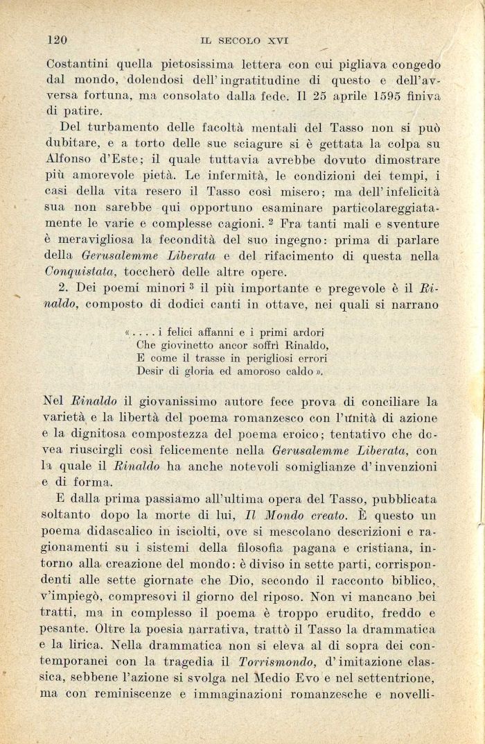 Del turbamento delle facoltà mentali del Tasso non si può dubitare, e a torto delle sue sciagure si è gettata la colpa su Alfonso d'Este; il quale tuttavia avrebbe dovuto dimostrare più amorevole pietà. Le infermità, le condizioni dei tempi, i casi della vita resero il Tasso così misero ; ma dell' infelicità sua non sarebbe qui opportuno esaminare particolareggiatamente le varie e complesse cagioni. 2 Fra tanti mali e sventure è meravigliosa la fecondità del suo ingegno : prima di parlare della Gerusalemme Liberata e del rifacimento di questa nella Conquistata, toccherò delle altre opere.