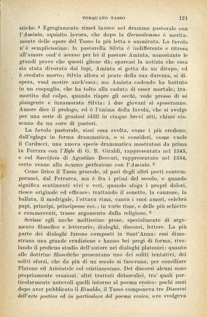 La favola pastorale, siasi essa svolta, come i più credono, dall'egloga in forma drammatica, o si consideri, come vuole il Carducci, una nuova specie drammatica mostratasi da prima in Ferrara con l'Egle di G. B. Giraldi, rappresentata nel 1545, e col Sacrificio di Agostino Beccari, rappresentato nel 1554, certo venne alla somma ^perfezione con VAminta. 5