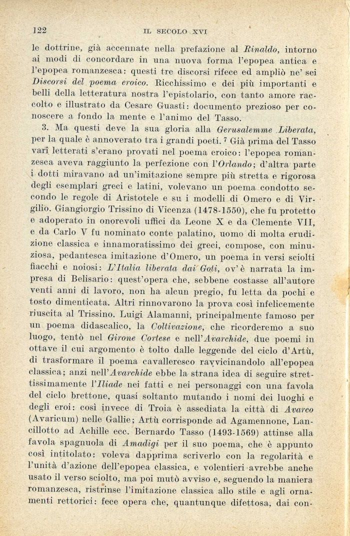 3. Ma questi deve la sua gloria alla Gerusalemme Liberata, per la quale è annoverato tra i grandi poeti. 7 Già prima del Tasso vari letterati s'erano provati nel poema eroico : l'epopea romanzesca aveva raggiunto la perfezione con VOrlando; d'altra parte i dotti miravano ad un'imitazione sempre più stretta e rigorosa degli esemplari greci e latini, volevano un poema condotto secondo le regole di Aristotele e su i modelli di Omero e di Virgilio. Giangiorgio Trissino di Vicenza (1478-1550), che fu protetto e adoperato in onorevoli uffici da Leone X e da Clemente VII, e da Carlo V fu nominato conte palatino, uomo di molta erudizione classica e innamoratissimo dei greci, compose, con minuziosa, pedantesca imitazione d'Omero, un poema in versi sciolti fiacchi e noiosi: L'Italia liberata dai Goti, ov'è narrata la impresa di Belisario: quest'opera che, sebbene costasse all'autore venti anni di lavoro, non ha alcun pregio, fu letta da pochi e tosto dimenticata. Altri rinnovarono la prova cosi infelicemente riuscita al Trissino. Luigi Alamanni, principalmente famoso per un poema didascalico, la Coltivazione, che ricorderemo a suo luogo, tentò nel Girone Cortese e nell'Avarchide, due poemi in ottave il cui argomento è tolto dalle leggende del ciclo d'Artù, di trasformare il poema cavalleresco ravvicinandolo all'epopea classica; anzi nell'Avarchide ebbe la strana idea di seguire strettissimamente l'Iliade nei fatti e nei personaggi con una favola del ciclo brettone, quasi soltanto mutando i nomi dei luoghi e degli eroi: così invece di Troia è assediata la città di Avarco (Avaricum) nelle Gallie; Artù corrisponde ad Agamennone, Lancillotto ad Achille ecc. Bernardo Tasso (1493-1569) attinse alla favola spagnuola di Amadigi per il suo poema, che è appunto così intitolato: voleva dapprima scriverlo con la regolarità e l'unità d'azione dell'epopea classica, e volentieri avrebbe anche usato il verso sciolto, ma poi mutò avviso e, seguendo la maniera romanzesca, ristrinse l'imitazione classica allo stile e agli ornamenti rettorici: fece opera che, quantunque difettosa, dai con-