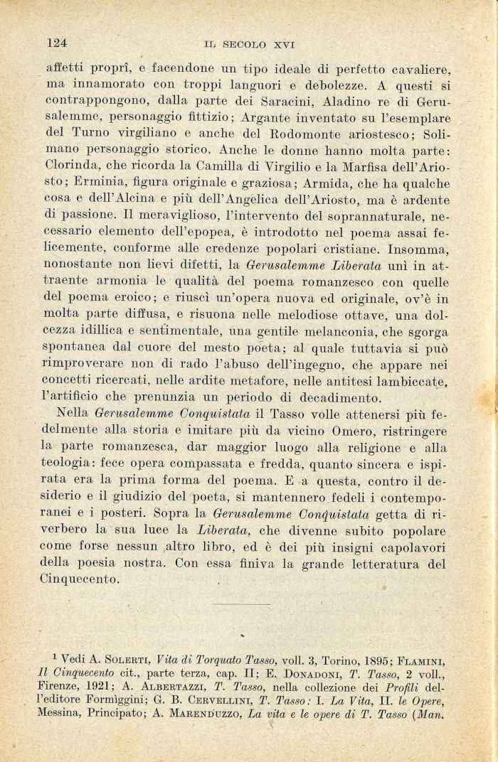 1 Vedi A. Solerti, Vita di Torquato Tasso, voli. 3, Torino, 1895; Flamini, Il Cinquecento cit., parte terza, cap. II; E. Donadoni, T. Tasso, 2 voli., Firenze, 1921; A. Albertazzi, T. Tasso, nella collezione dei Profili dell'editore Formìggini; G. B. Cervellini, T. Tasso: 1. La Vita, II. le Opere, Messina, Principato; A. Marend'uzzo, La vita e le opere di T. Tasso (Man.