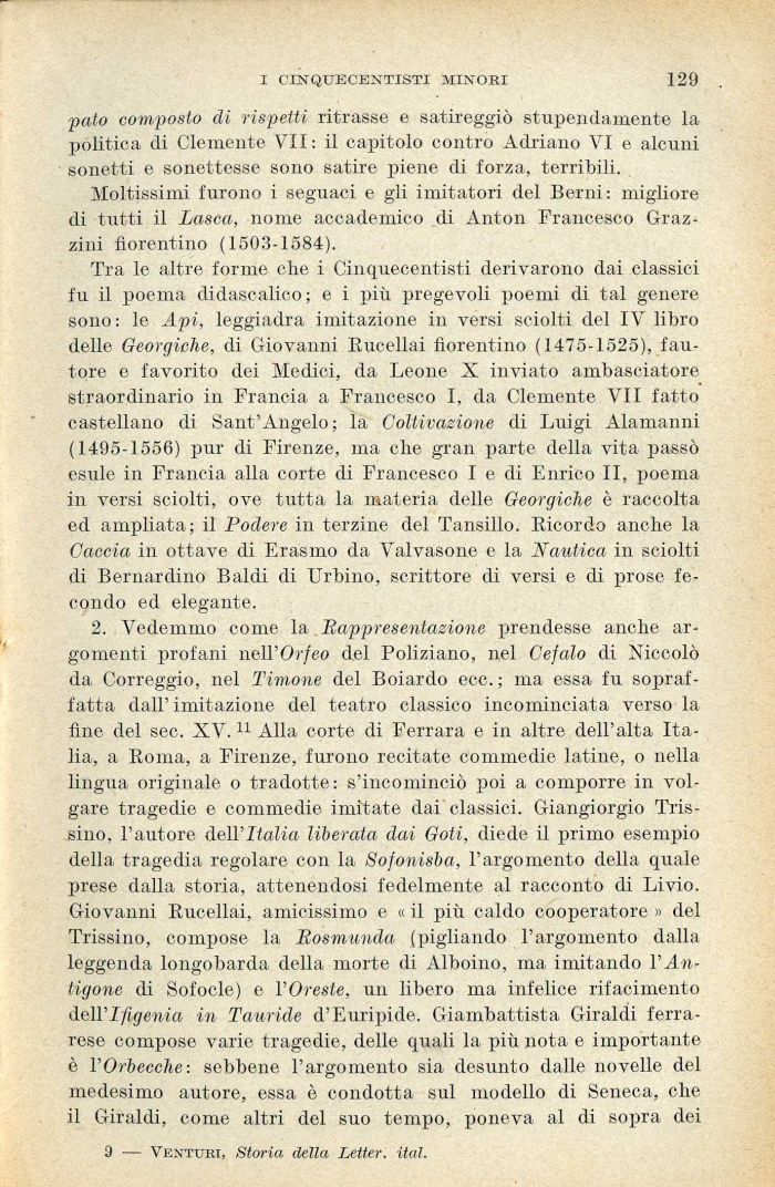 2. Vedemmo come la Rappresentazione prendesse anche argomenti profani nell'Orfeo del Poliziano, nel Cefalo di Niccolò da Correggio, nel Timone del Boiardo ecc.; ma essa fu sopraffatta dall' imitazione del teatro classico incominciata verso la fine del sec. XV.11 Alla corte di Ferrara e in altre dell'alta Italia, a Roma, a Firenze, furono recitate commedie latine, o nella lingua originale o tradotte: s'incominciò poi a comporre in volgare tragedie e commedie imitate dai classici. Giangiorgio Tris-sino, l'autore dell'Italia liberata dai Goti, diede il primo esempio della tragedia regolare con la Sofonisba, l'argomento della quale prese dalla storia, attenendosi fedelmente al racconto di Livio. Giovanni Rucellai, amicissimo e « il più caldo cooperatore » del Trissino, compose la Rosmunda (pigliando l'argomento dalla leggenda longobarda della morte di Alboino, ma imitando l'Antigone di Sofocle) e l'Oreste, un libero ma infelice rifacimento dell'Ifigenia in Tauride d'Euripide. Giambattista Giraldi ferrarese compose varie tragedie, delle quali la più nota e importante è l'Orbecche: sebbene l'argomento sia desunto dalle novelle del medesimo autore, essa è condotta sul modello di Seneca, che il Giraldi, come altri del suo tempo, poneva al di sopra dei